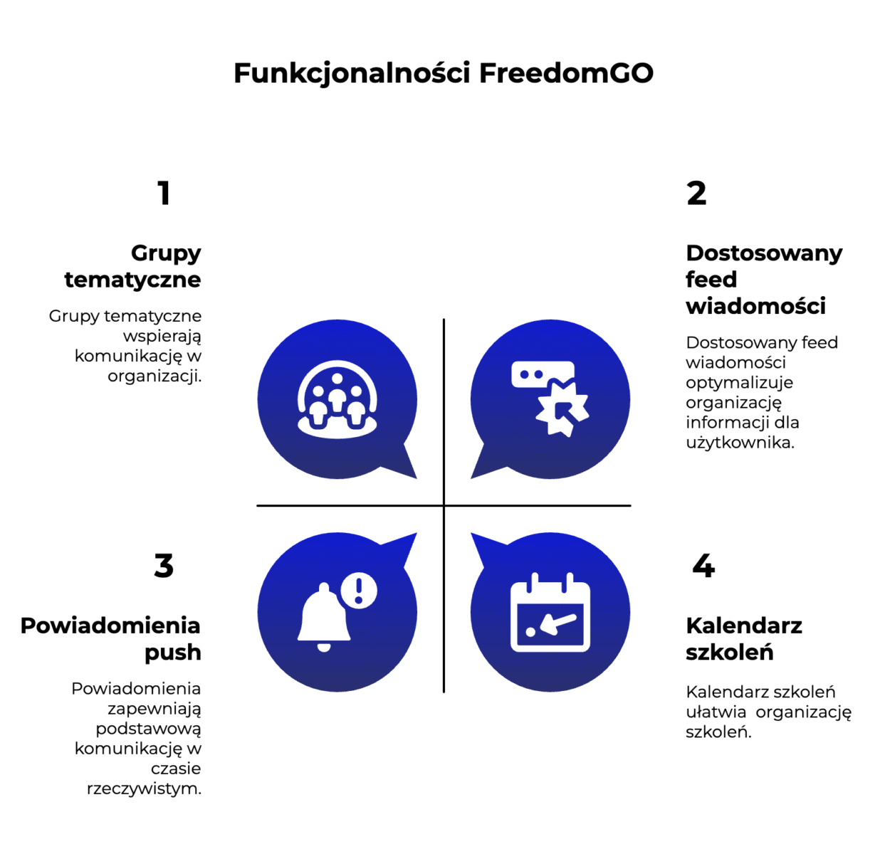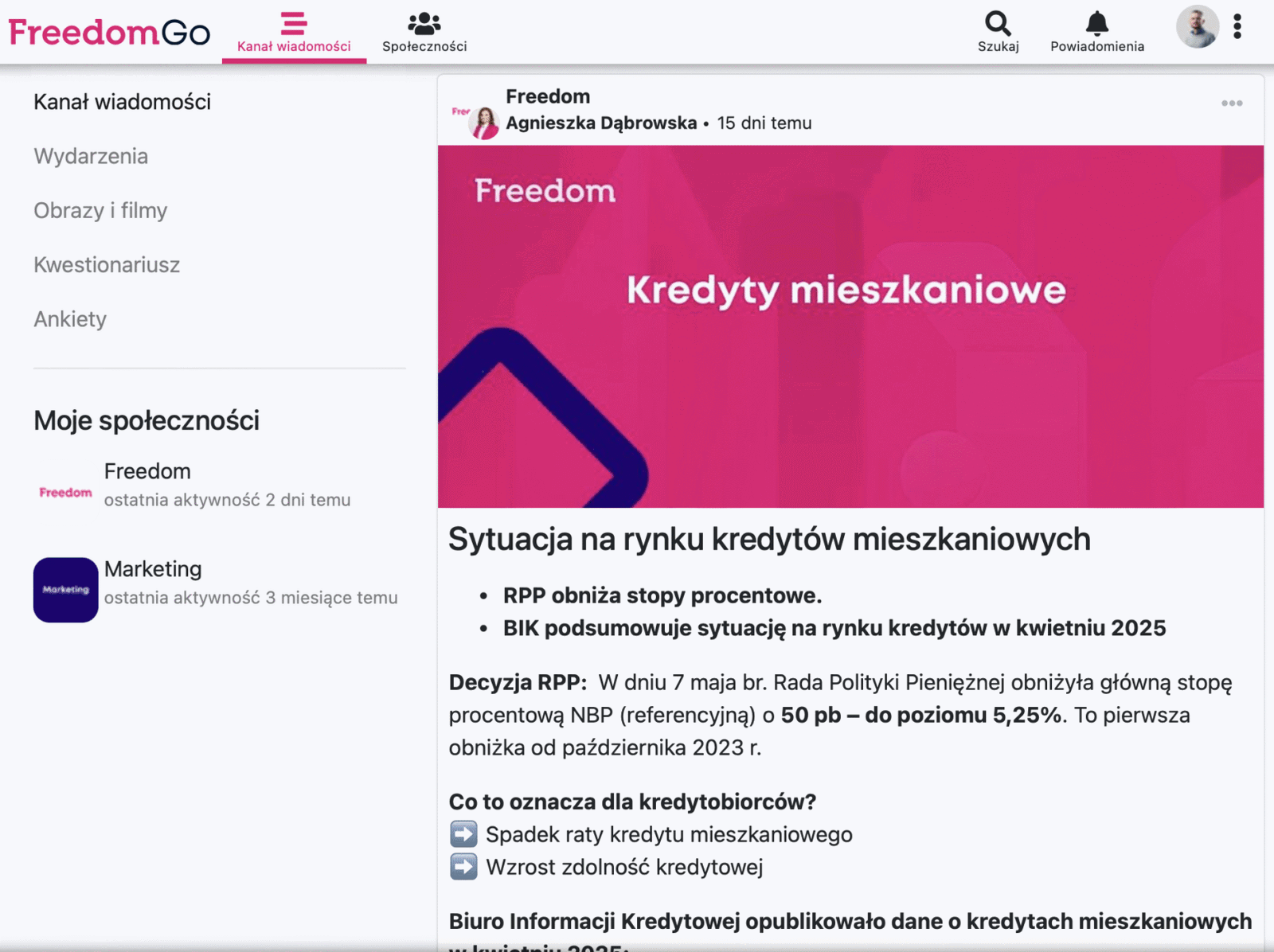 Korzystanie z FreedomGO oznacza dla agentów Freedom szybki dostęp do wszystkich informacji i bieżącej komunikacji. W jednym miejscu znajdą komunikaty z centrali i od liderów poszczególnych oddziałów. Mogą dołączać do tematycznych społeczności, takich jak Ogłoszenia i wymiana doświadczeń, Szkolenia, Case studies czy Sprzedaż i marketing osobisty, aby otrzymywać dokładnie te informacje, które są dla nich najbardziej istotne. Mają też możliwość komentowania postów, udziału w ankietach, zadawania pytań – a wszystko to w bezpiecznym, zamkniętym środowisku.