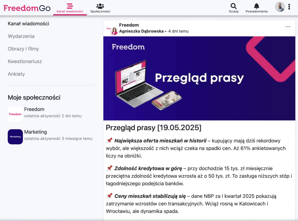 Wraz z rozwojem ogólnopolskiej sieci biur nieruchomości Freedom, potrzeba sprawnej, bezpiecznej i zorganizowanej komunikacji wewnętrznej stała się decydująca dla dalszego rozwoju i efektywności działań. Odpowiedzią na to wyzwanie jest FreedomGO – autorska aplikacja pełniąca funkcję intranetu, która integruje całą sieć i umożliwia łatwe dzielenie się informacjami wewnątrz organizacji.