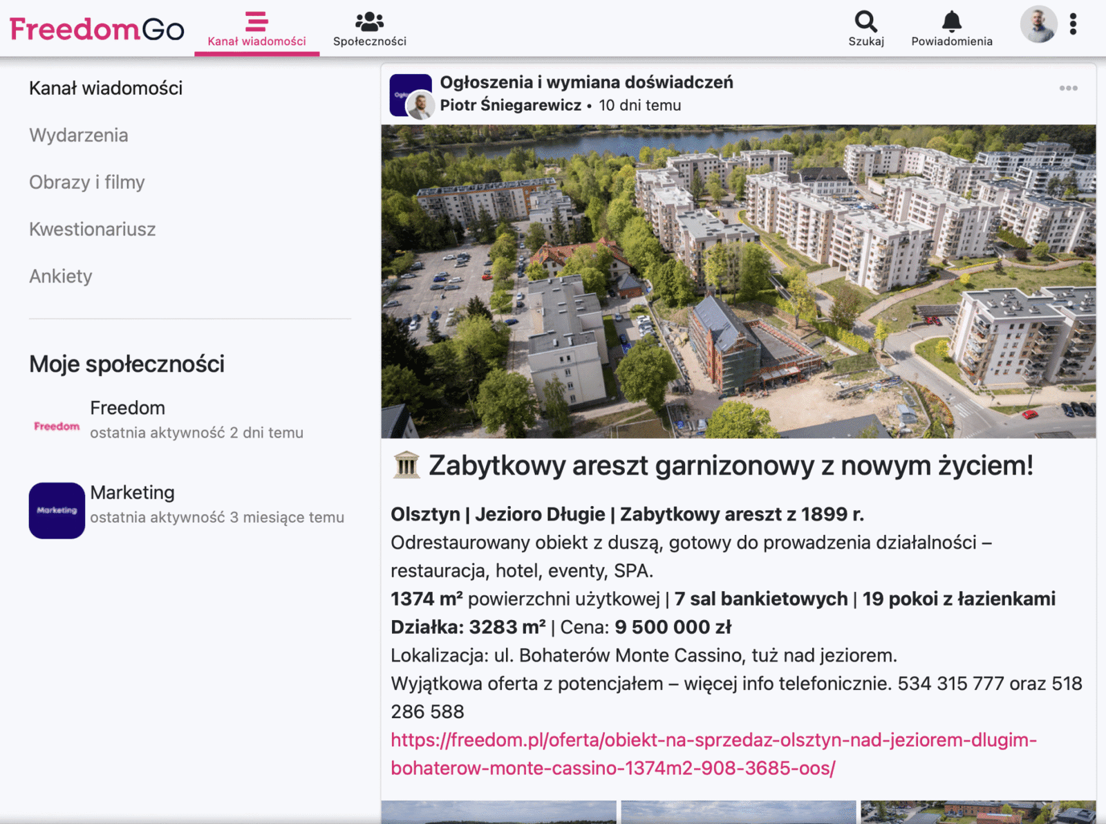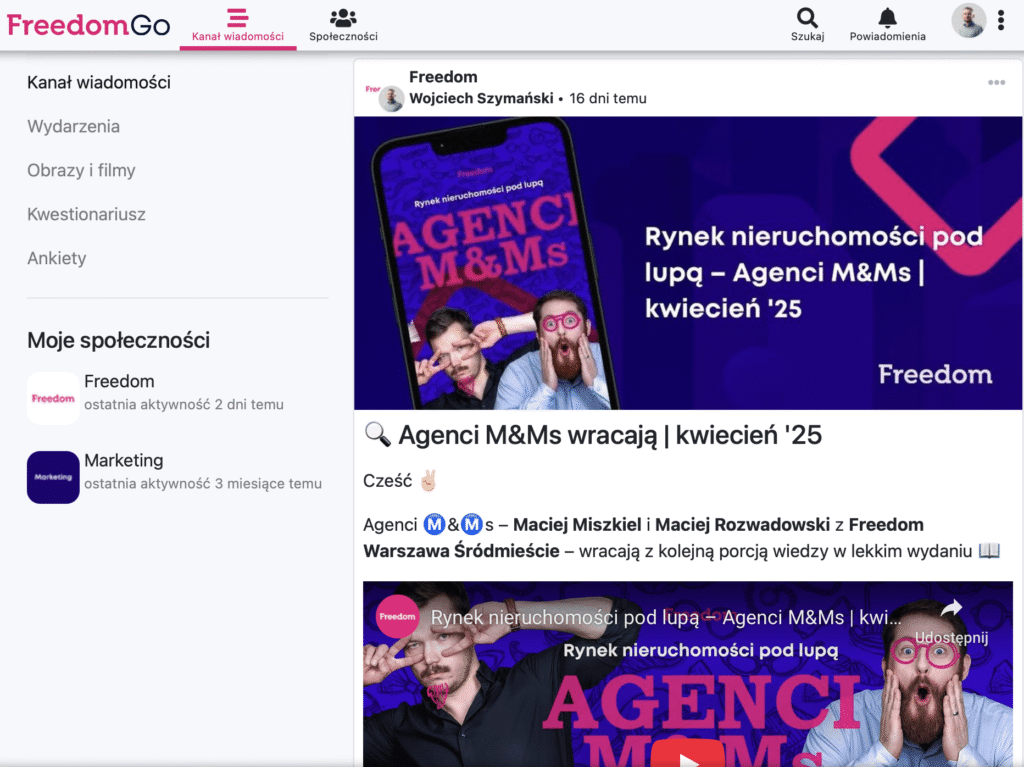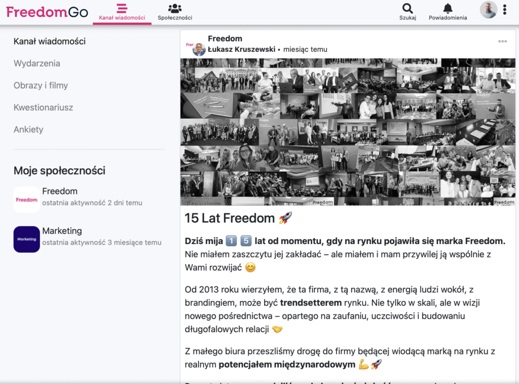 FreedomGO pozwala też tworzyć własne treści – posty ze zdjęciami, wydarzenia, ankiety czy formularze – wszystko w jednym, zintegrowanym miejscu, nad którym mamy pełną kontrolę. Dzięki temu osoby, które zakończyły współpracę z Freedom, automatycznie tracą dostęp do wewnętrznych zasobów – a my mamy pewność, że ważne informacje zostają wyłącznie w gronie aktywnych członków sieci.