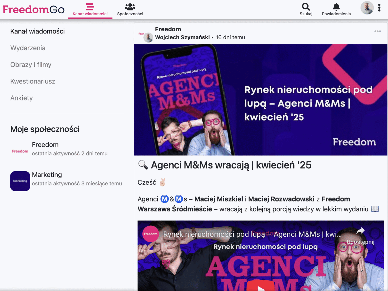 We FreedomGO komunikacja odbywa się w ramach dedykowanych grup, które można łatwo przeglądać i przypinać do menu bocznego. Każdy użytkownik jest automatycznie przypisany do grupy ogólnofirmowej Freedom (wszyscy) oraz do grup systemowych FreedomGO i Freedom ORIGO CRM, gdzie publikowane są istotne informacje z centrali. Oprócz tego agenci mogą dołączać do otwartych grup tematycznych, takich jak Szkolenia, Marketing czy Prawo.