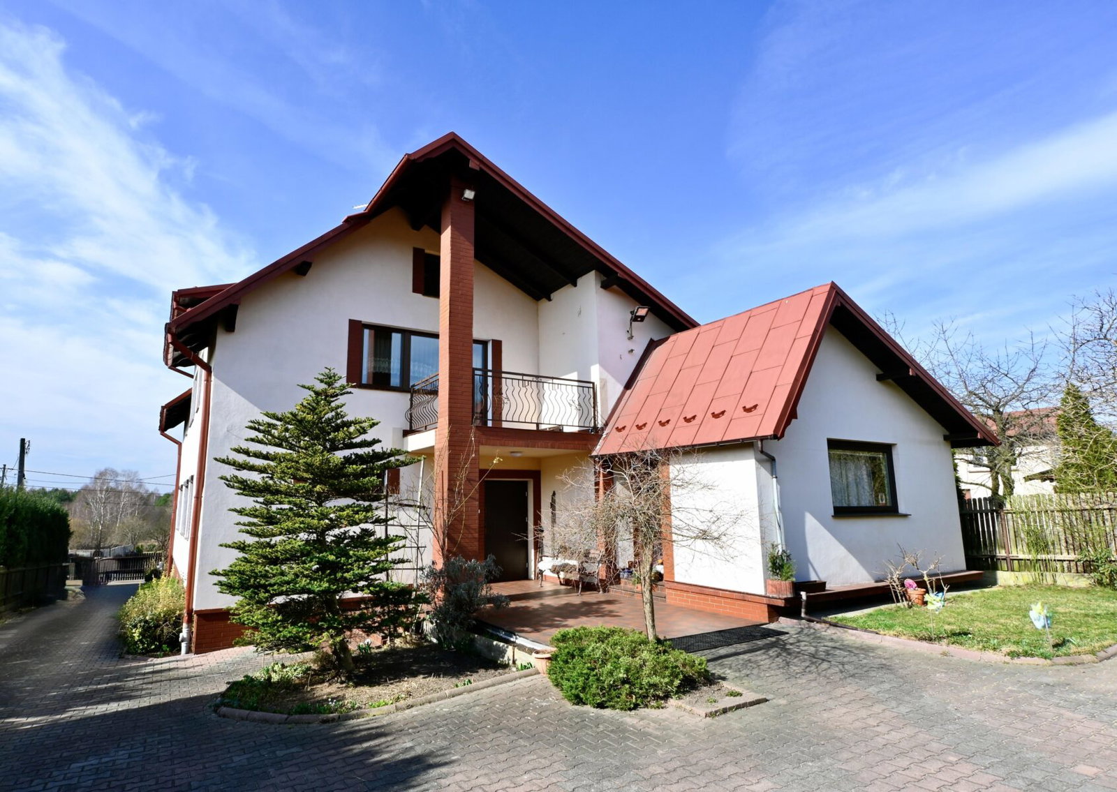 Budynek został solidnie wybudowany w 1994 roku i oferuje aż 328 m² całkowitej powierzchni na trzech kondygnacjach – parterze, w pełni użytkowym poddaszu oraz zagospodarowanej piwnicy.