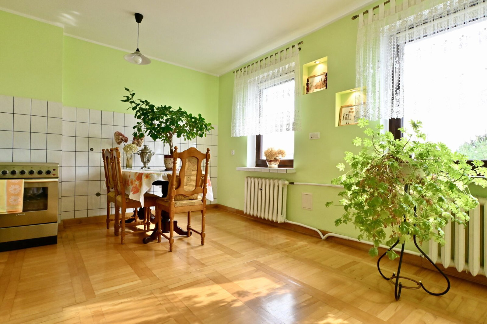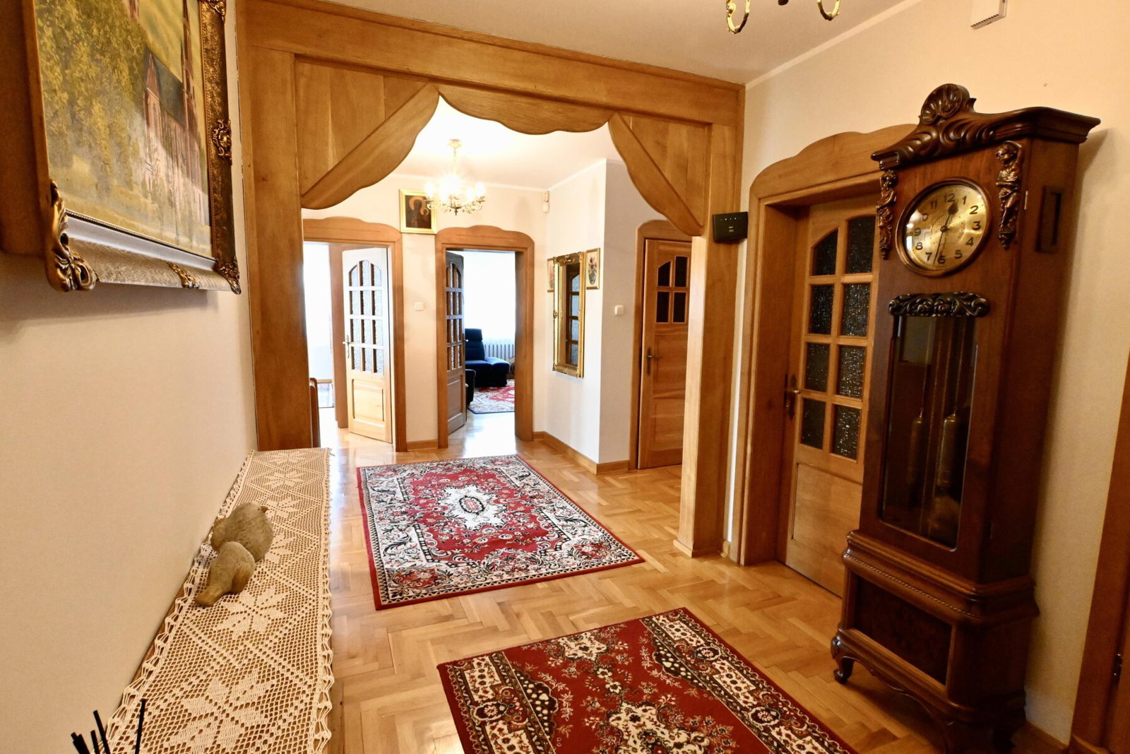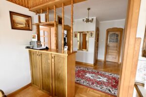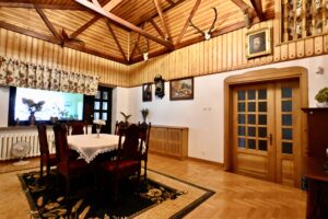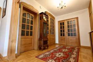 Wnętrze zachwyca – unikalna stolarka drewniana, piękne zdobienia, wykończenia z wysokiej jakości materiałów, które tworzą klimat przytulnego, rodzinnego domu z klasą.