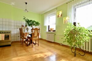 Dom ma przestronny układ z 7 pokojami, w tym dwa pokoje dzienne oraz kuchnię z jadalnią. Na parterze znajduje się również spiżarnia, łazienka, WC oraz dodatkowy pokój. Poddasze zostało zaadaptowane na strefę mieszkalną, co daje możliwość urządzenia sypialni lub gabinetu.