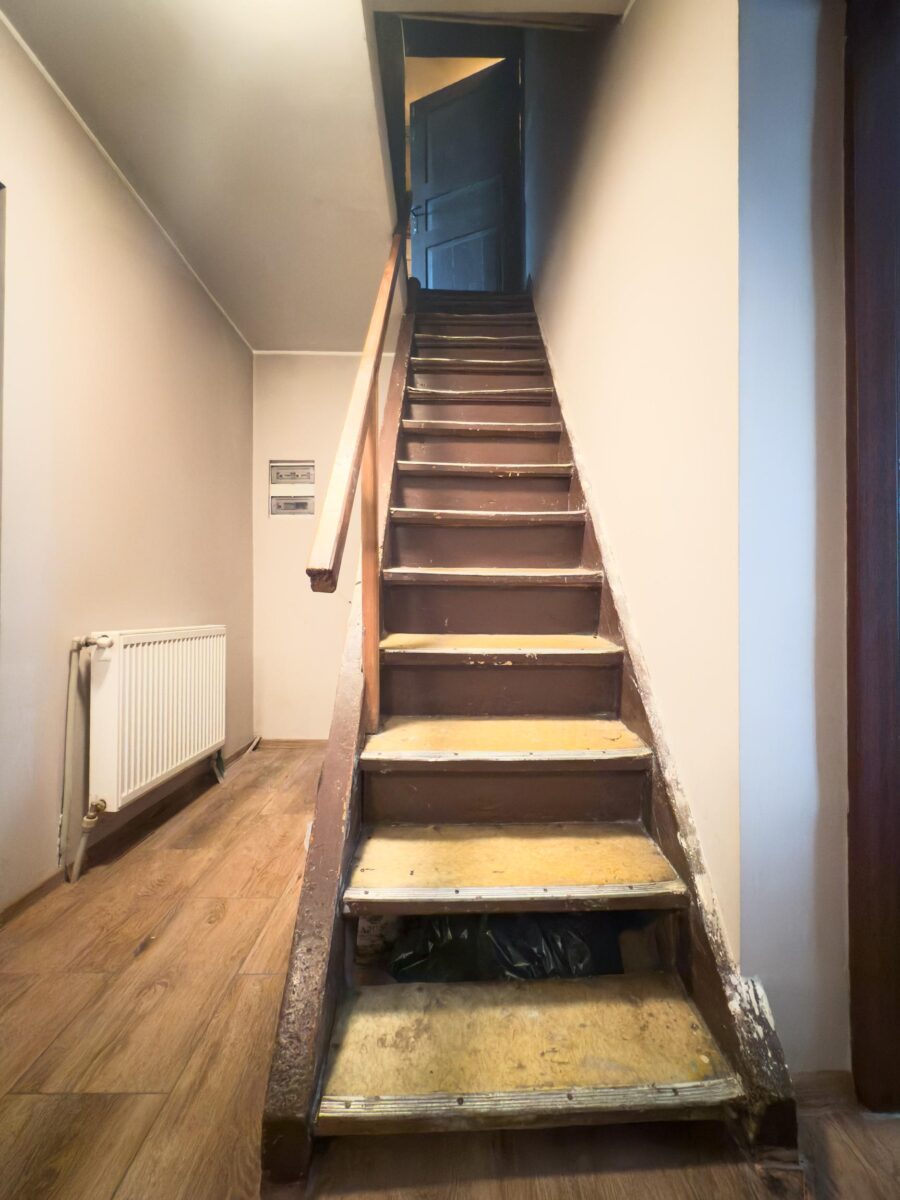 - Piętro: stan do remontu; znajdują się tu 2 mniejsze i 1 duży pokój – przestrzeń idealna do własnej aranżacji