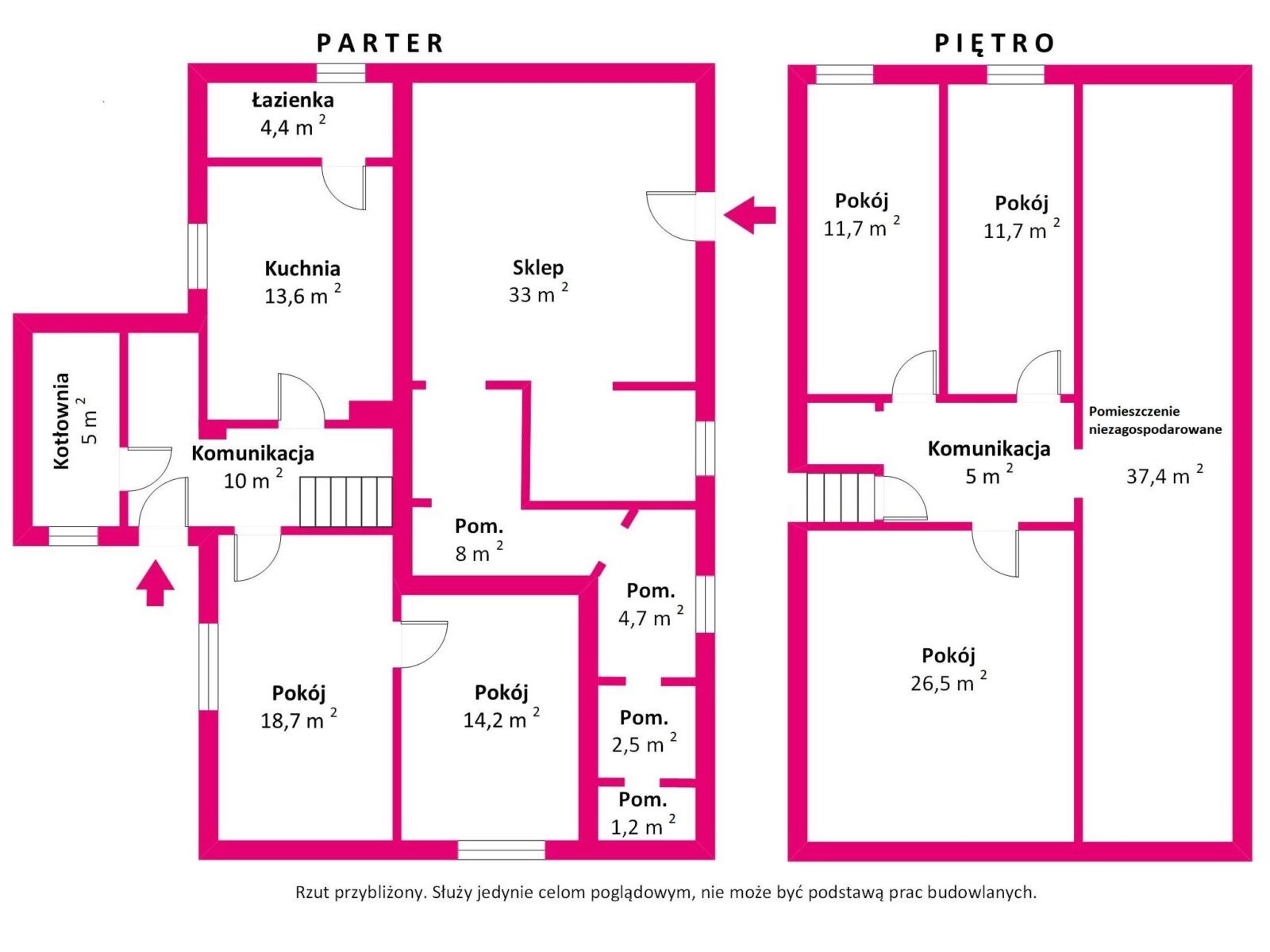 - Parter: 2 pokoje (w tym jeden przechodni), kuchnia oraz łazienka – łazienka wymaga kapitalnego remontu