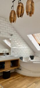 Góra część mieszkalna to salon, sypialnie, duży pokój kąpielowy.
