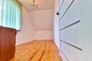 Piętro: dwa duże pokoje z możliwością wydzielenia trzeciego, garderoba, łazienka, korytarz.