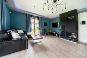 Dom ma przemyślany układ funkcjonalny. Na parterze znajduje się przestronny salon z kominkiem (30 m²) połączony z nowoczesną kuchnią (15 m²), a także łazienka, spiżarnia, pralnia z suszarnią oraz kotłownia. Na piętrze znajdują się dwie sypialnie, garderoba, imponująca łazienka oraz przestronny pokój rekreacyjny (33 m²), idealny na domowe kino lub strefę relaksu.
