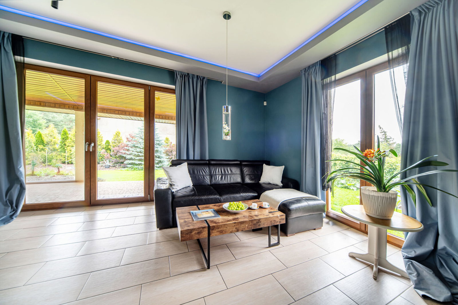 W domu pozostaje pełne wyposażenie, w tym system Smart Home, który umożliwia kontrolę nad oświetleniem i ogrzewaniem. Szczegóły dotyczące dodatkowego wyposażenia dostępne są po kontakcie.
