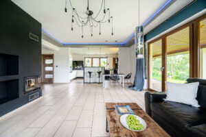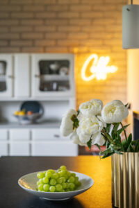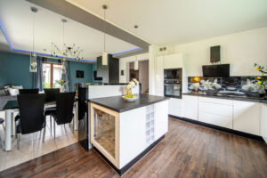 Na parterze czeka na Ciebie przestronny salon z kominkiem (30 m²) płynnie połączony z nowoczesną kuchnią (15 m²) – oddzieloną stylową wyspą z barkiem. To serce domu – miejsce spotkań, rozmów i wspólnych posiłków.