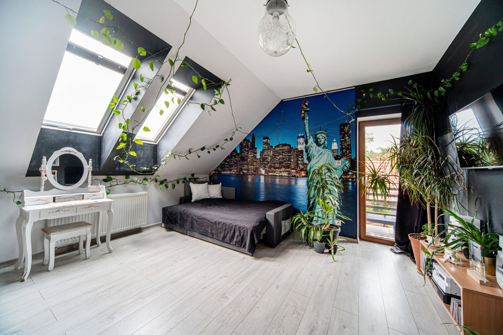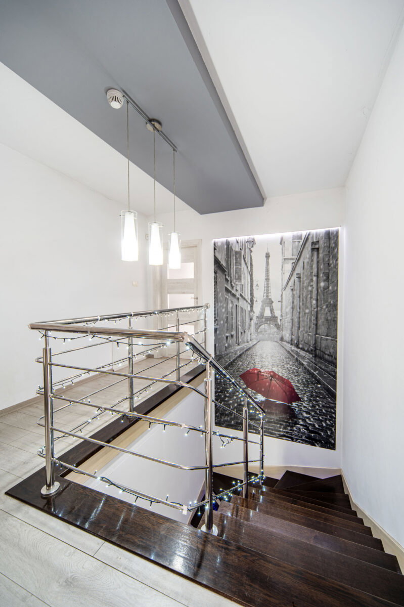 Piętro to Twoja prywatna strefa relaksu: dwie sypialnie, garderoba, imponująca łazienka oraz przestronny pokoj rekreacyjny (33 m²) – idealny na domowe kino, pracownię, czy strefę relaksu.