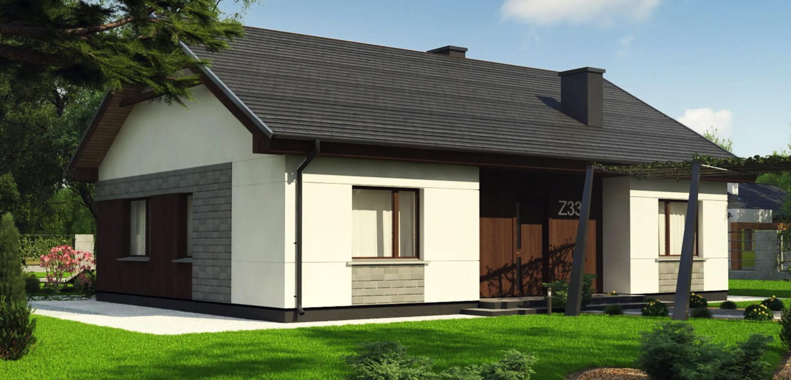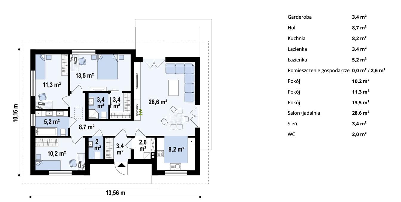 Dom ma powierzchnię 100 m² i składa się z 4 pokoi oraz 2 łazienek. Możesz również wybrać większą wersję o powierzchni 135 m², co daje możliwość dostosowania układu do własnych potrzeb.