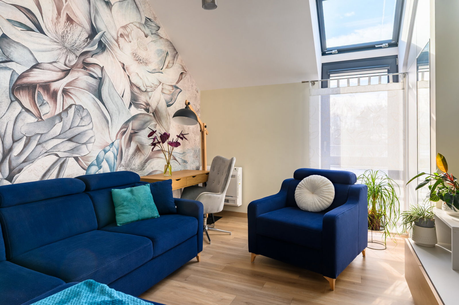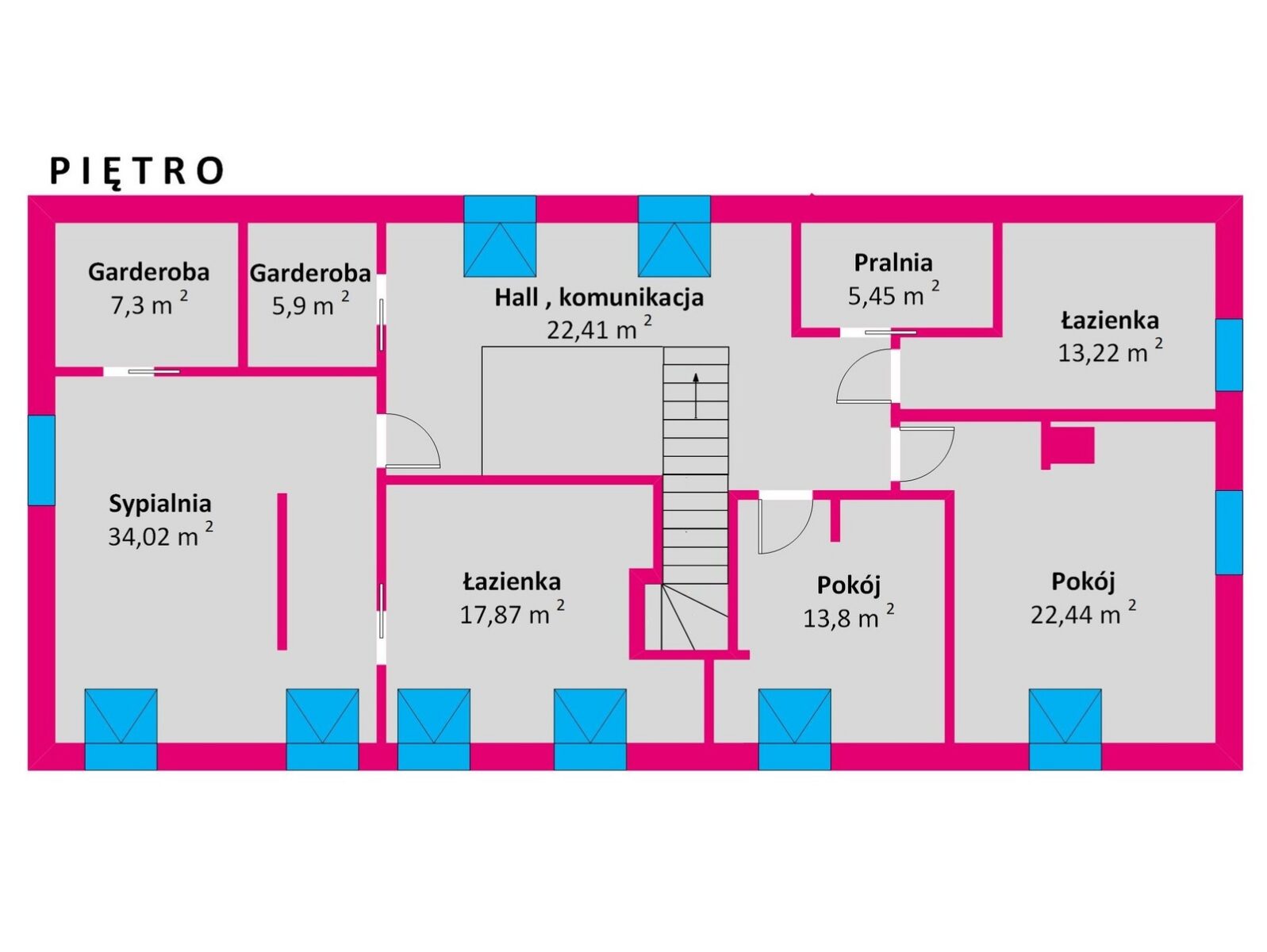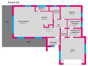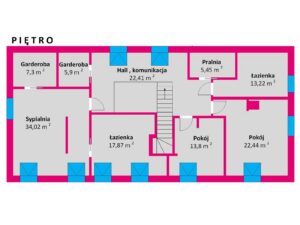 - Powierzchnie pokoi: 65,9+19,75+34,02+22,44+13,8