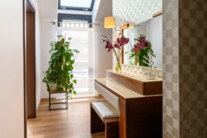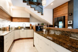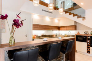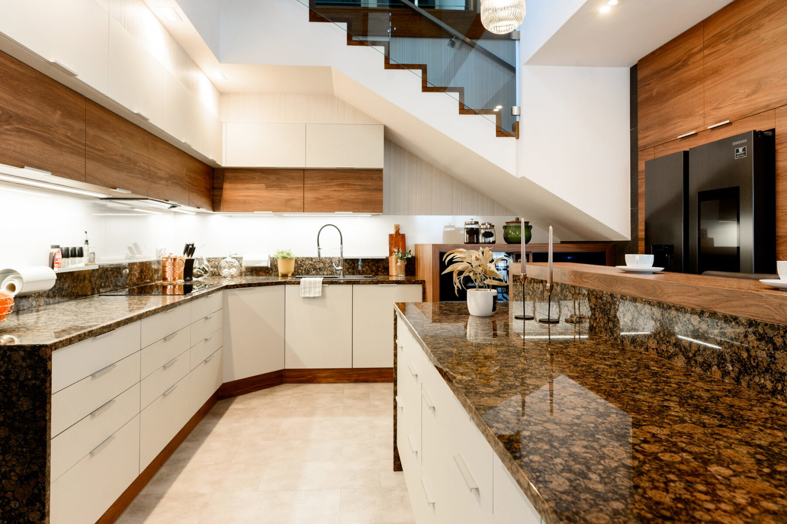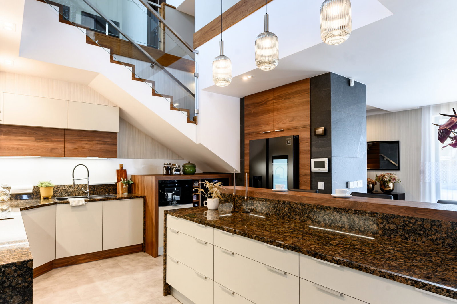 Dom ma funkcjonalny układ, w tym na parterze salon z jadalnią, kuchnię z oddzielną spiżarnią, gabinet, łazienkę oraz dwa pomieszczenia gospodarcze. Na piętrze znajdują się trzy sypialnie, w tym główna z garderobą i łazienką z jacuzzi, a także pralnia i sauna.