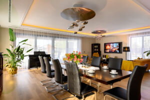 Wszystkie nowoczesne technologie i wyposażenie, takie jak pompa ciepła, klimatyzacja oraz system uzdatniania wody, pozostają w domu. Szczegóły dotyczące dodatkowego wyposażenia dostępne po kontakcie.