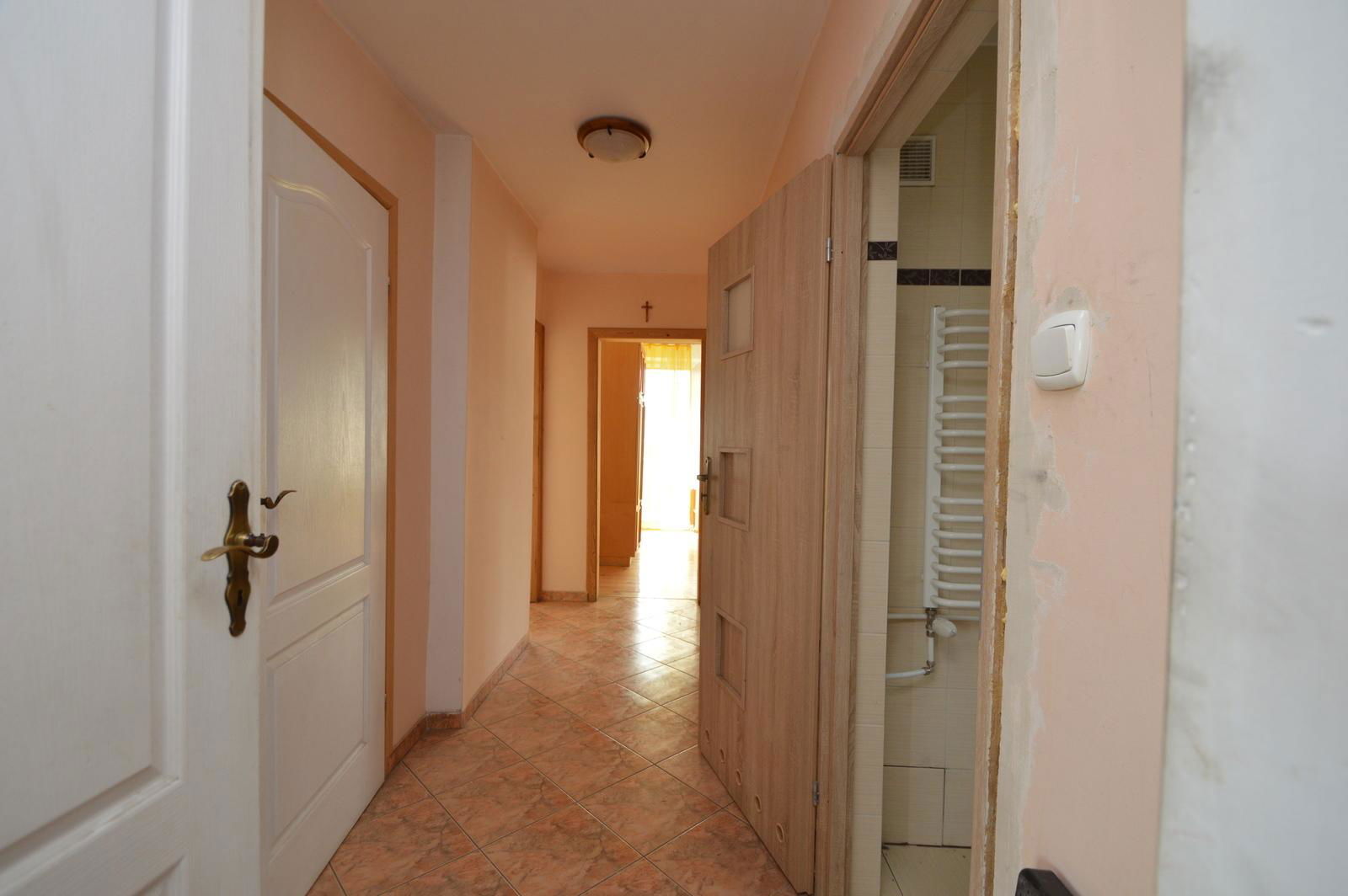 Dom podzielony jest na dwa mieszkania ( po około 60 mkw. każde )- do lokali wejście z klatki schodowej. Dwa balkony oraz taras. W przyziemiu piwnica, garaż z kanałem, kotłownia oraz dodatkowe pomieszkanie.