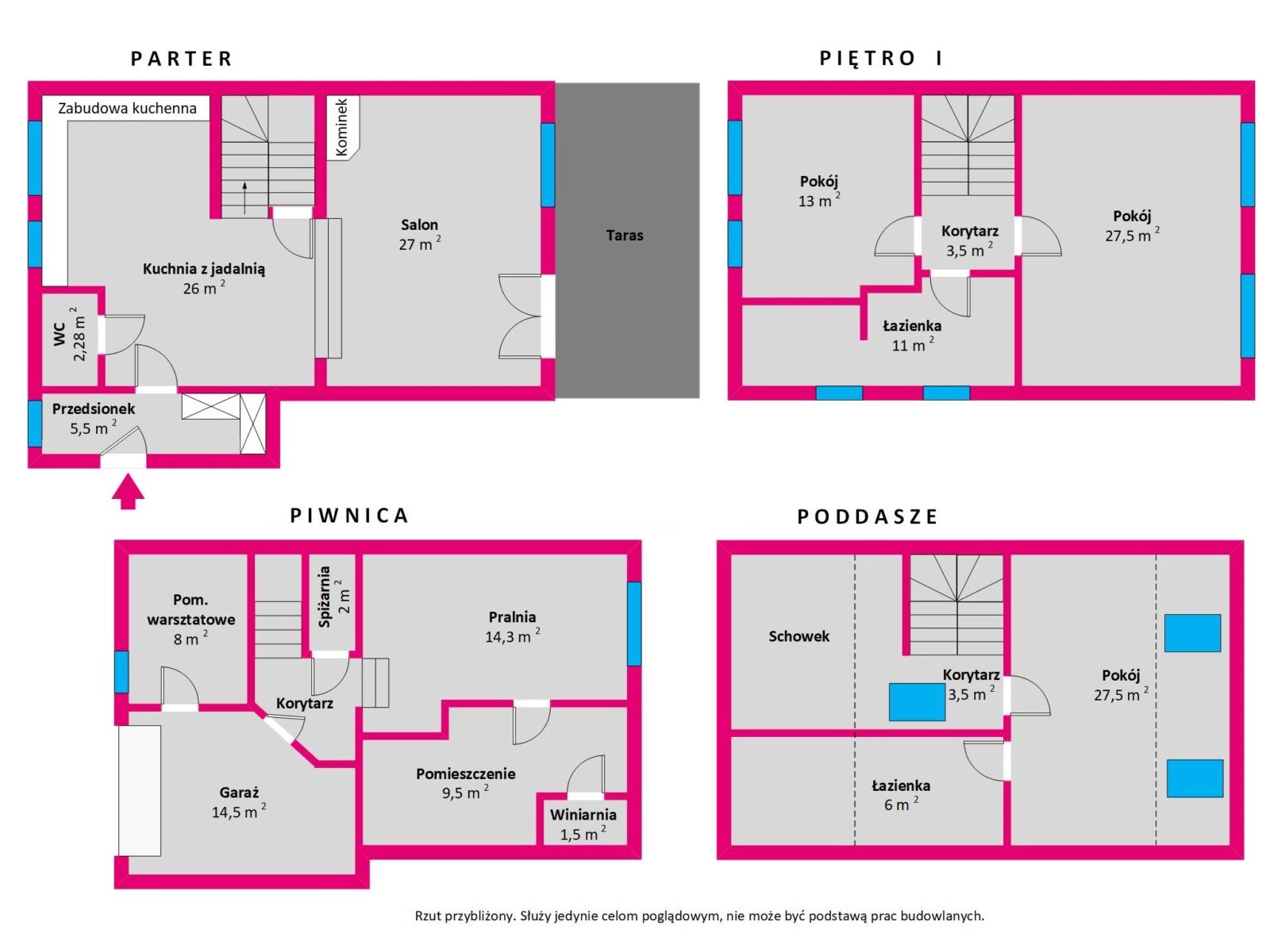 - Powierzchnie pokoi: 27; 27,5; 27,5; 13