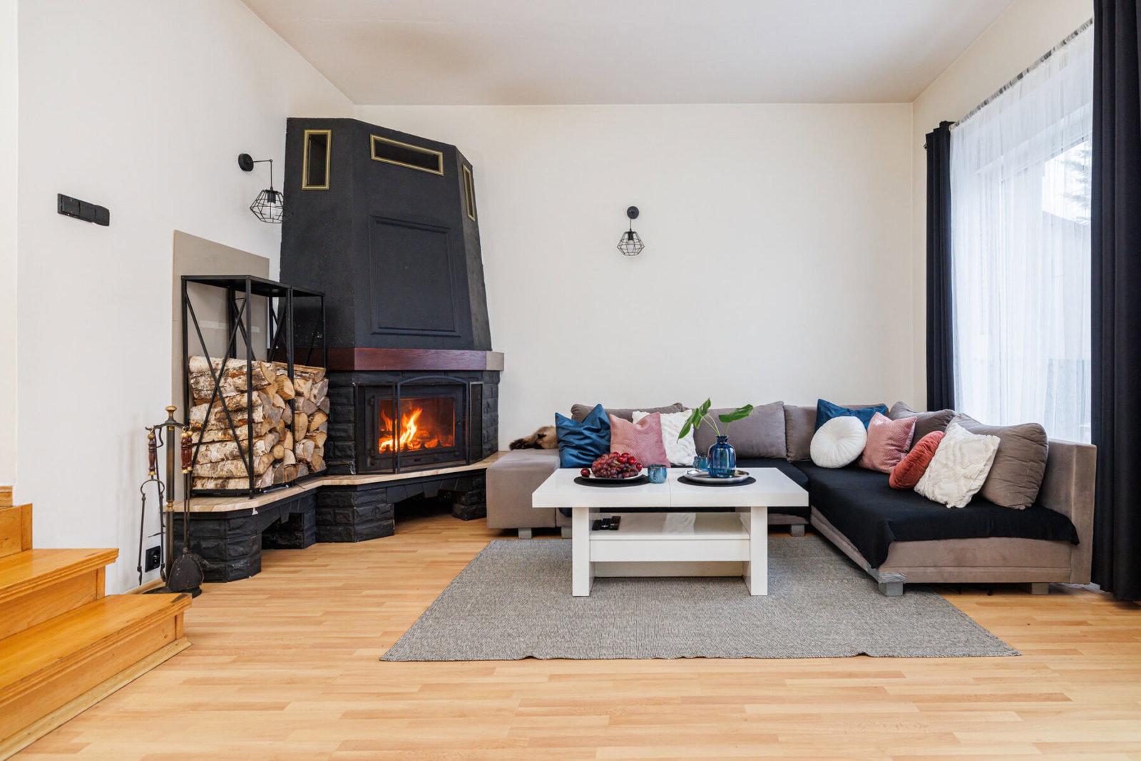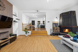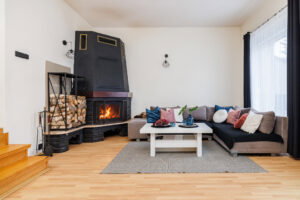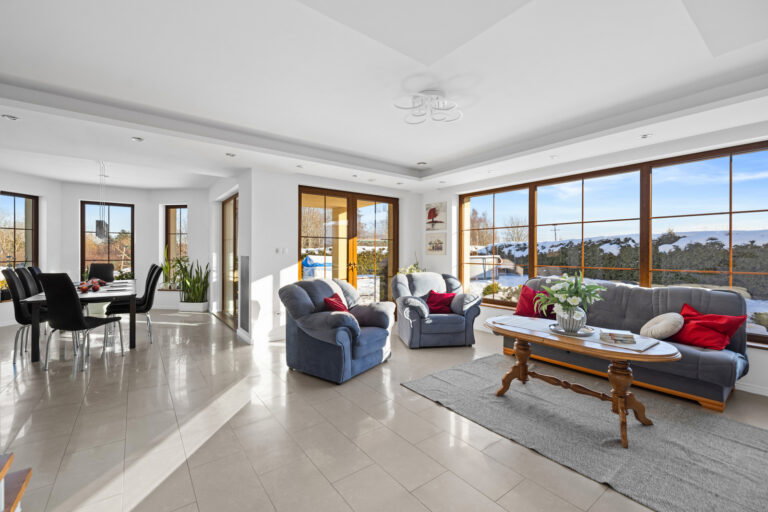 Salon z kominkiem to prawdziwe serce domu – ciepło z kominka rozprowadzane jest do pokoi, co znacząco obniża koszty ogrzewania i daje wyjątkowy komfort zimą.
