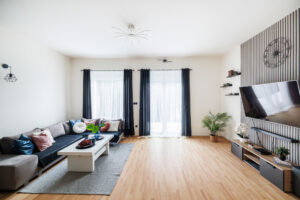 - Podłogi w pomieszczeniach: Panele, Płytki