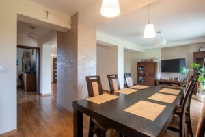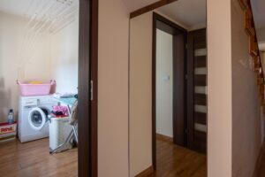 Dom ma przemyślany układ pomieszczeń, w tym 6 pokoi, co daje możliwość łatwego wydzielenia niezależnych lokali. Na parterze znajduje się salon z otwartą kuchnią, jeden pokój, pomieszczenie gospodarcze oraz garaż. Na piętrze są 4 pokoje, łazienka i osobne WC. Dodatkowo, strych ma potencjał na adaptację na 1-2 pokoje z kuchnią i łazienką.