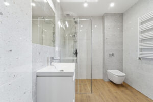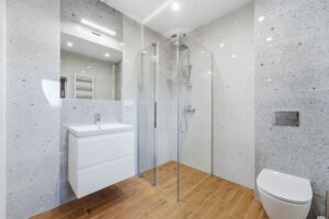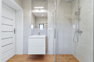 - łazienka z kabiną prysznicową z armatura łazienkową