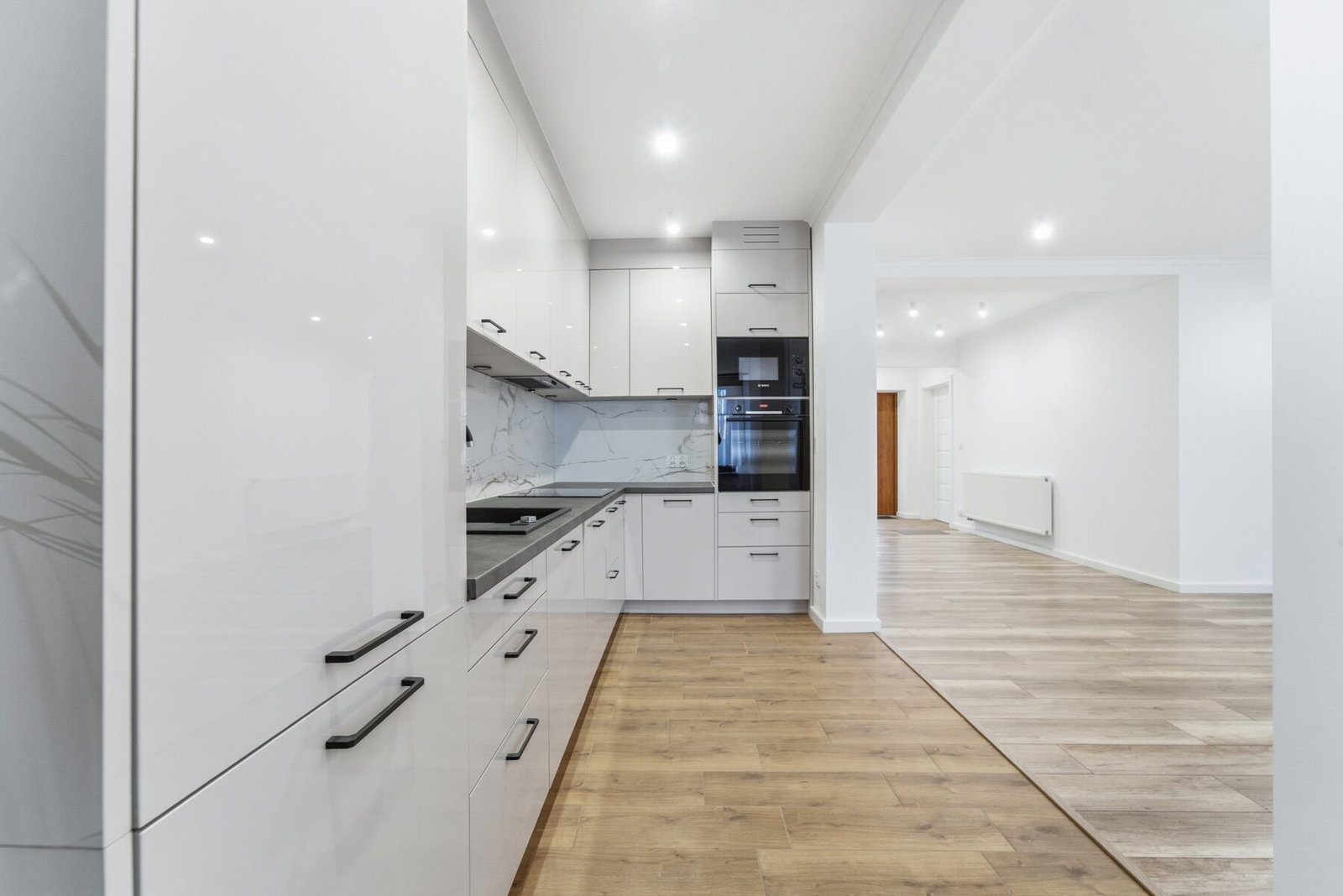 - zabudowana kuchnia na wymiar ze sprzętem: lodówka, zmywarka, piekarnik, kuchenka mikrofalowa, płyta indukcyjna, okap