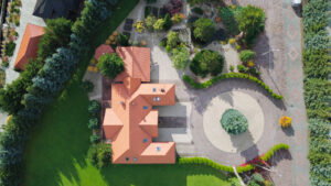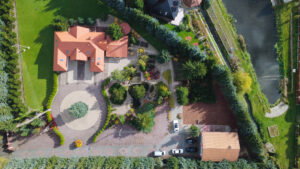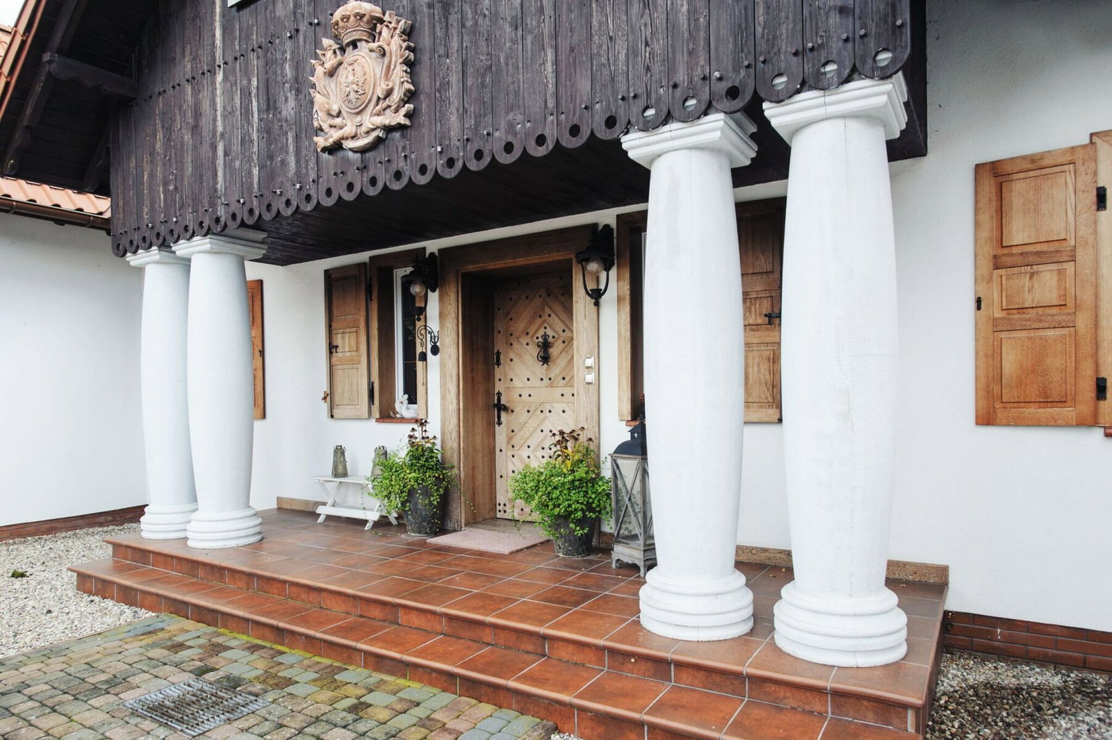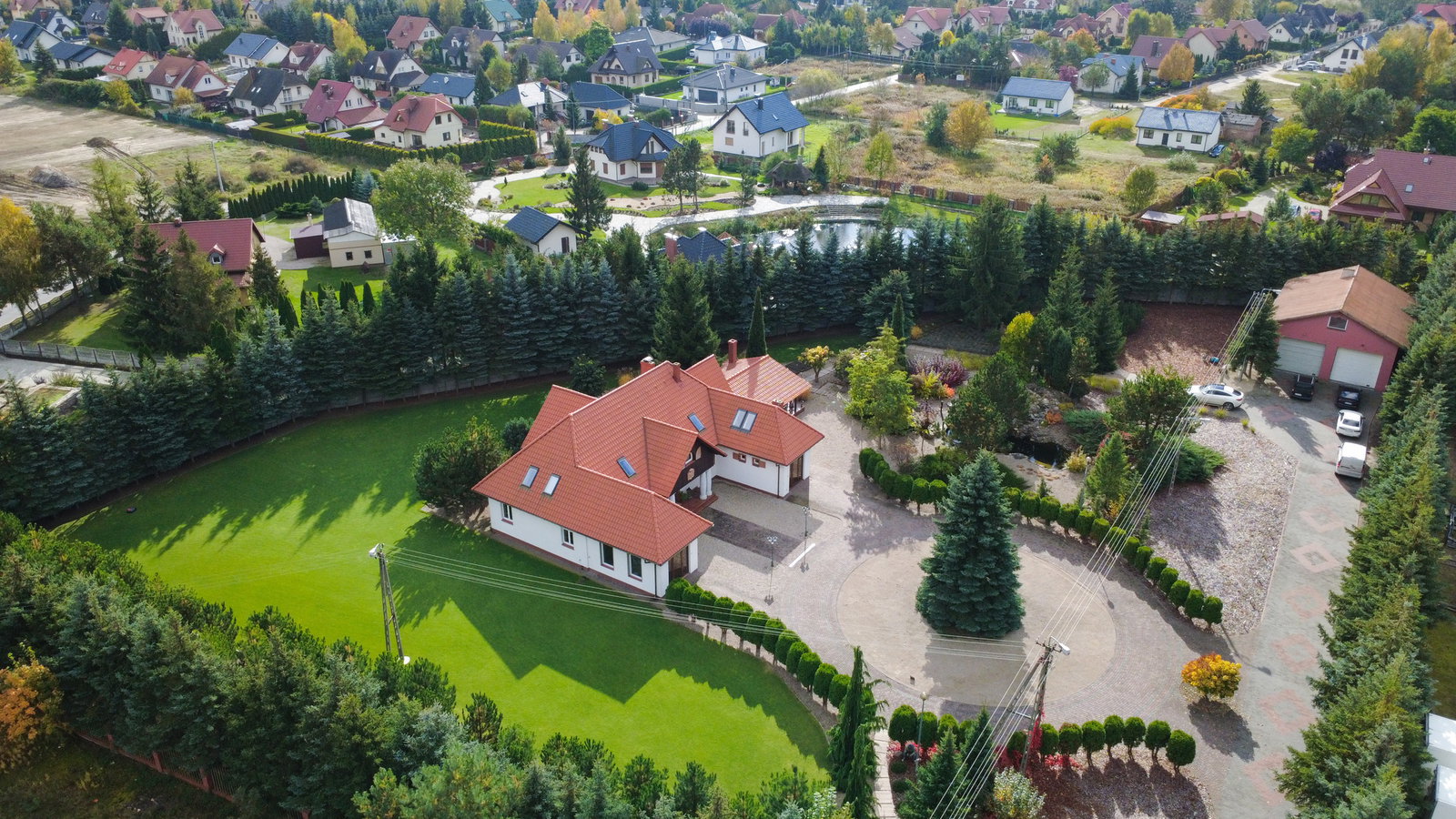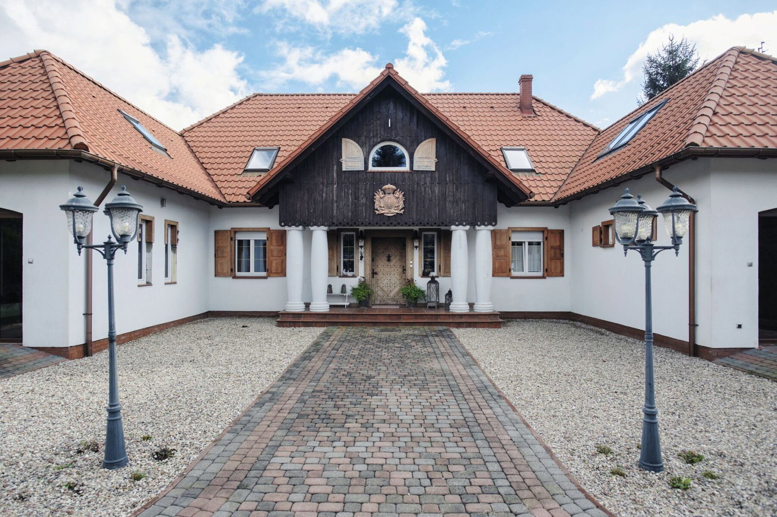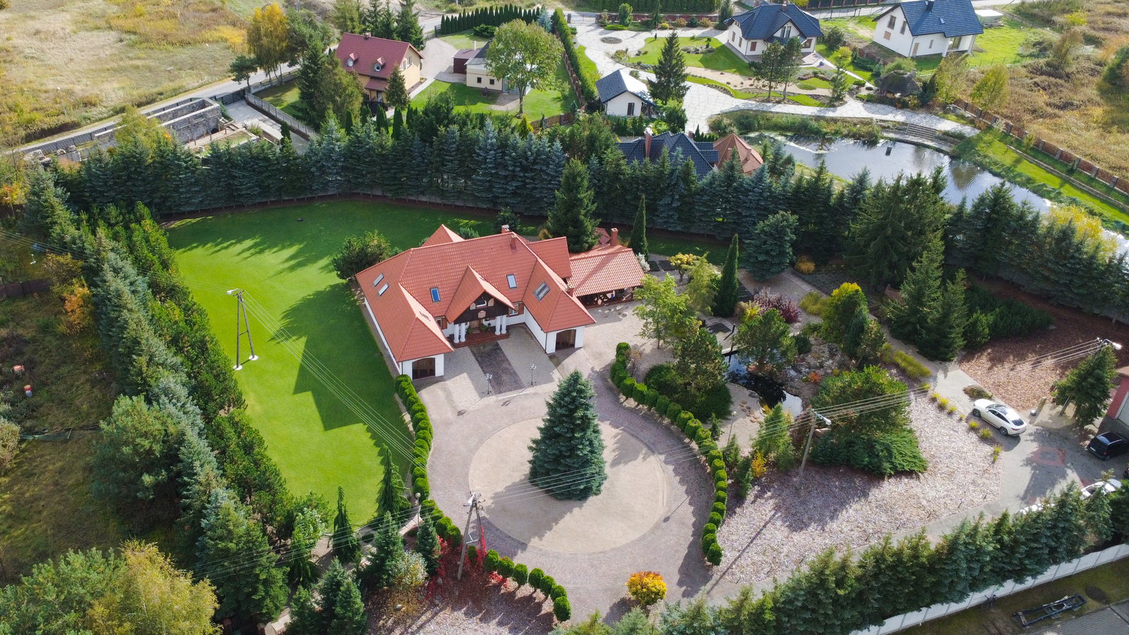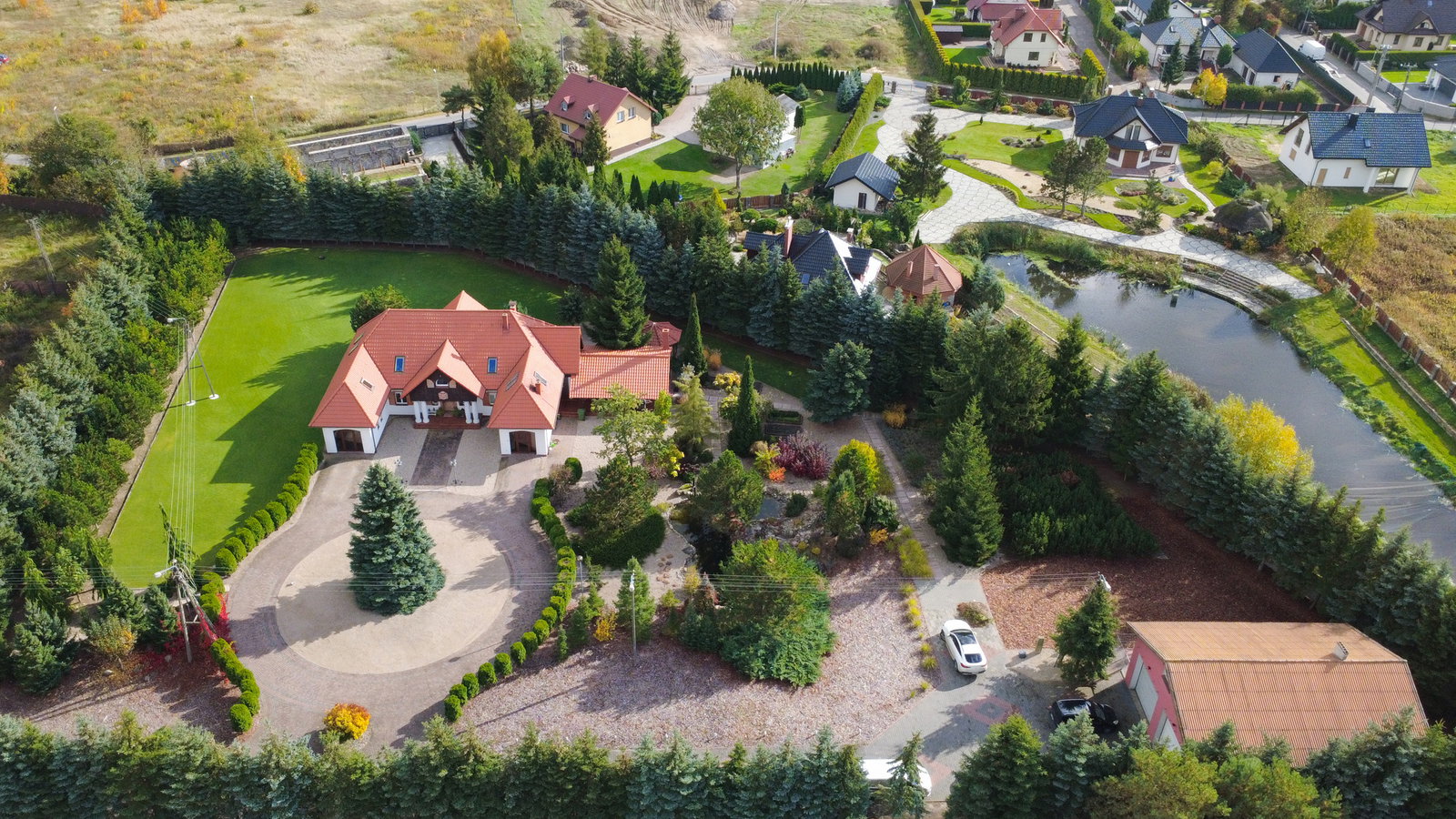 Całość uzupełnia efektowny podjazd w kształcie koła, podkreślający reprezentacyjny charakter nieruchomości.