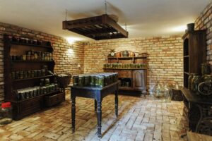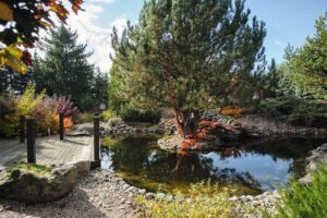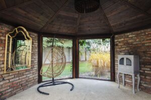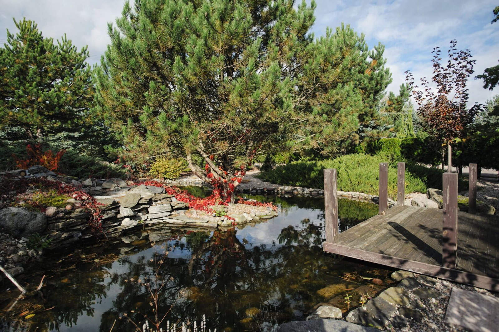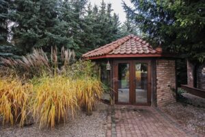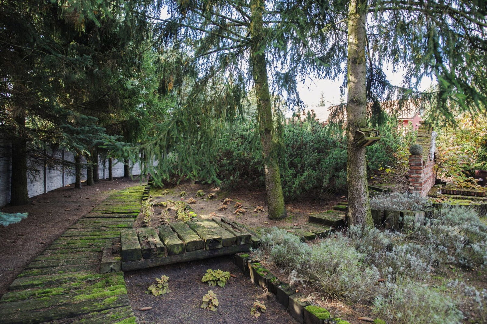 W ogrodzie, oprócz starannie zaprojektowanej zieleni i ozdobnych nasadzeń, znajduje się ziemianka w stylu starej cegły z pięknym, stylowym wejściem – wyjątkowy element dodający charakteru całej posesji. Nieopodal mieści się także nastrojowa altana, sprzyjająca relaksowi i odpoczynkowi wśród zieleni. Dodatkowo, na terenie posiadłości znajduje się zarybione oczko, robot koszący dbający o trawnik.