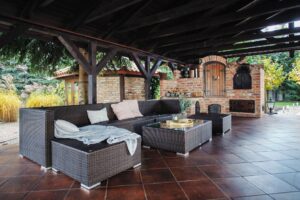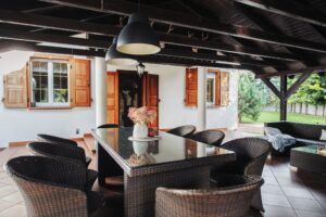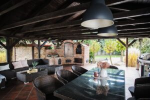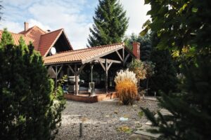 Serce tej posiadłości stanowi taras – duży, zadaszony i urządzony z myślą o wypoczynku oraz wspólnym spędzaniu czasu. Znajduje się tu piec do chleba lub pizzy, palniki, wędzarnia oraz strefa telewizyjno-wypoczynkowa. To idealne miejsce na spotkania w gronie rodziny i przyjaciół.