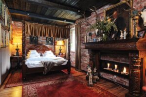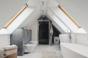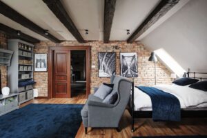 Na górze znajduje się wygodna, otwarta strefa dzienna oraz dwie sypialnie – jedna z garderobą, druga z własną łazienką. Całość utrzymana jest w stylu pełnym ciepła, detali i wyrafinowania. Dom ogrzewany jest piecem olejowym, wyposażony w przydomową oczyszczalnię ścieków, wodę miejską oraz niezależny system podlewania ogrodu.