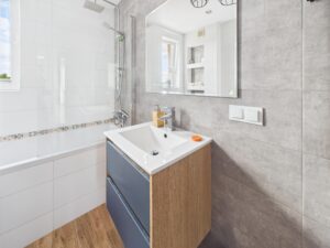 - Pierwsze piętro i poddasze użytkowe – łącznie dwa niezależne mieszkania z osobnymi wejściami z klatki schodowej