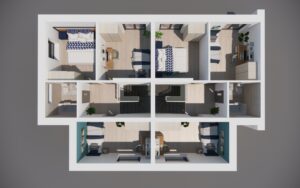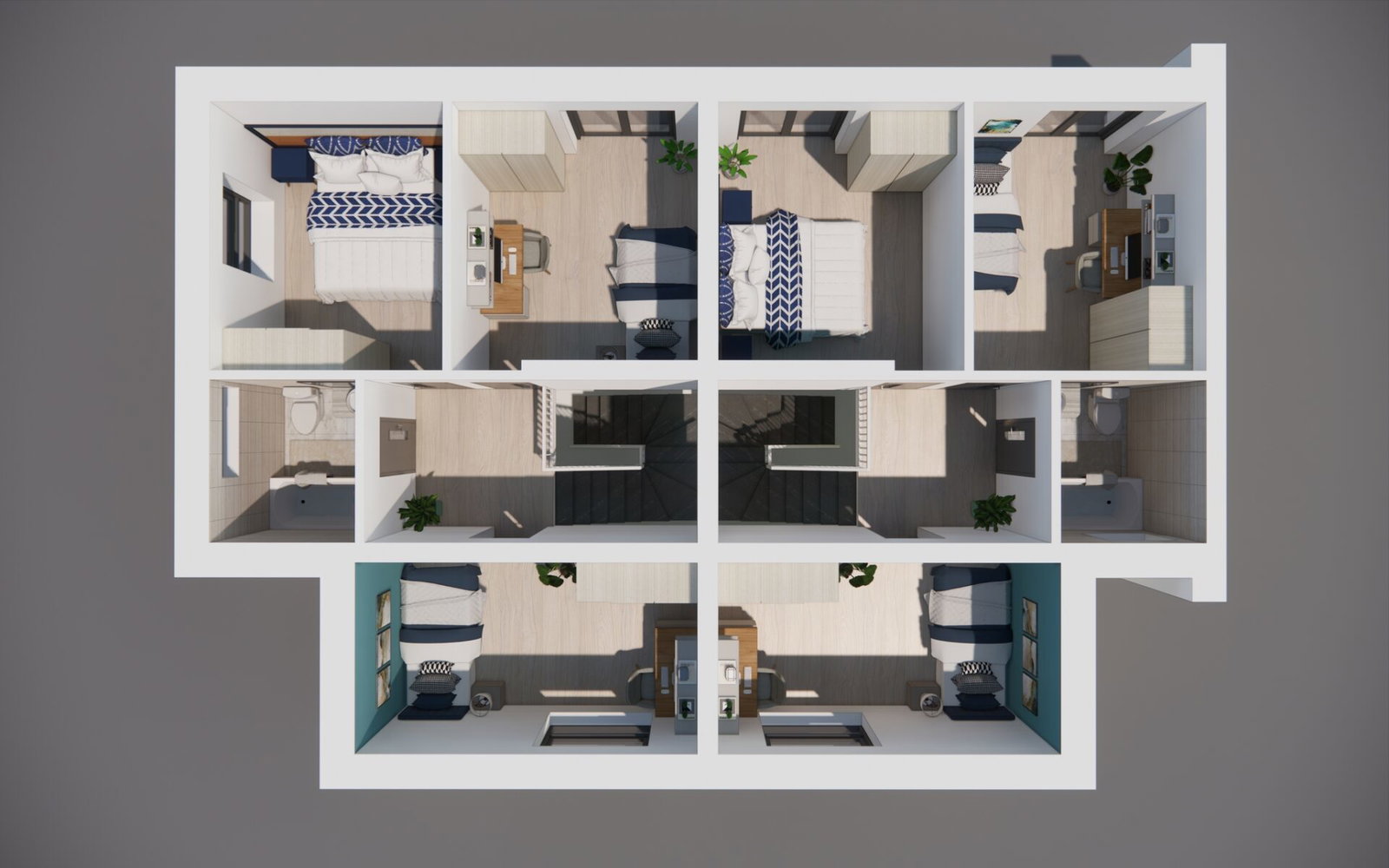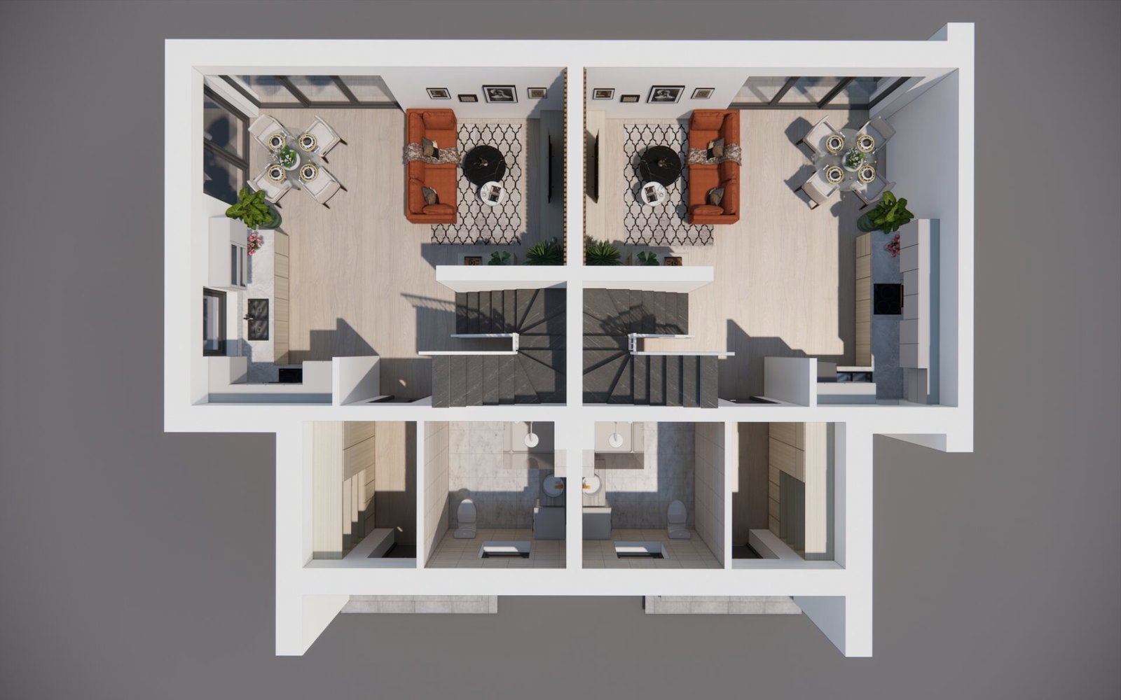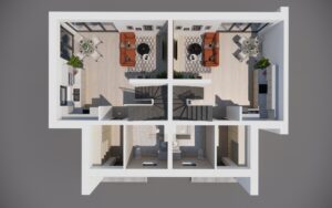 Bliźniak ma rozkład pomieszczeń na dwóch piętrach. Na parterze znajduje się wiatrołap, salon z aneksem kuchennym, łazienka oraz wygodne schody na piętro. Na piętrze są trzy pokoje oraz druga łazienka. Sypialnie są jasne i ustawne, co sprzyja komfortowemu życiu.