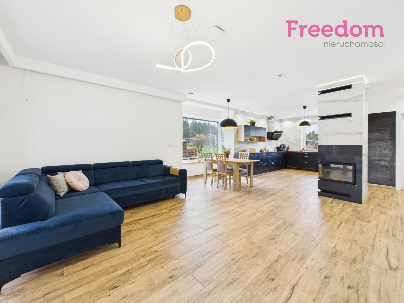 Dom ma cztery pokoje, w tym przestronny salon z kominkiem, który jest połączony z jadalnią i otwartą kuchnią. Dodatkowo znajdują się dwie eleganckie łazienki oraz garderoba.
