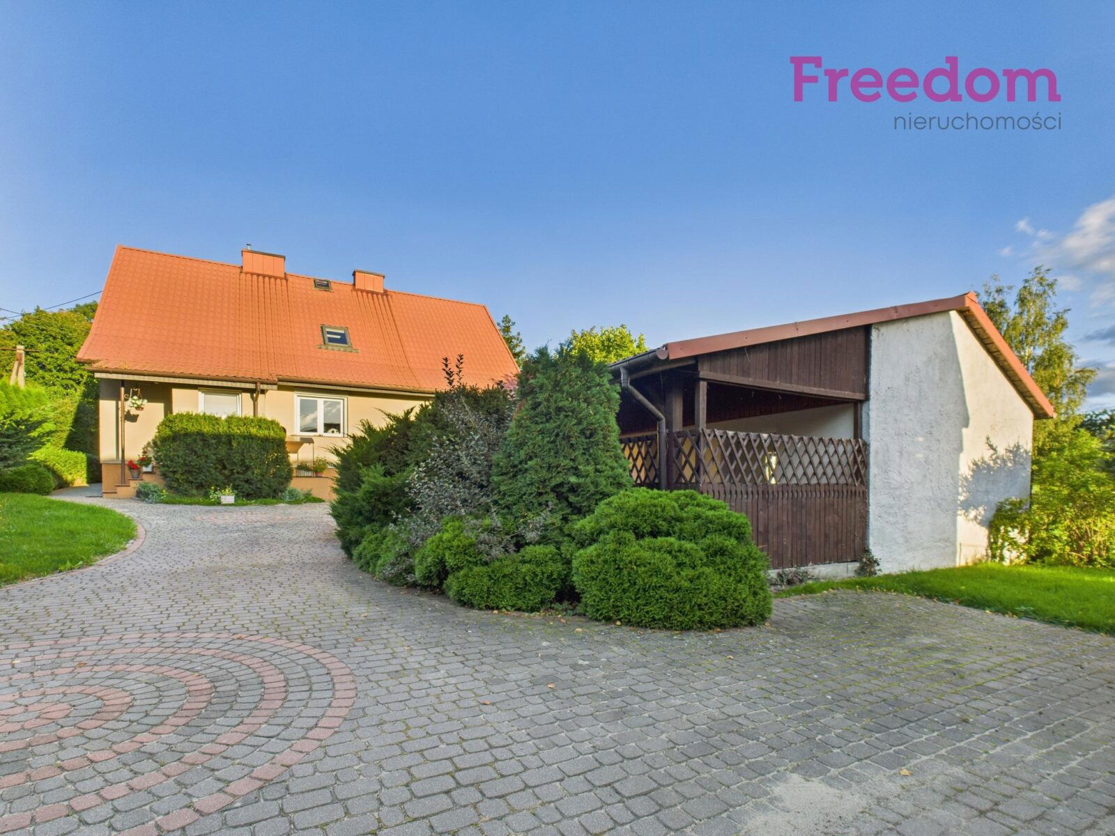 Tak, dom posiada wolnostojący garaż oraz dodatkowe miejsca parkingowe na działce, co zapewnia wygodę dla mieszkańców.