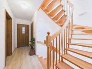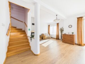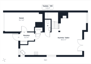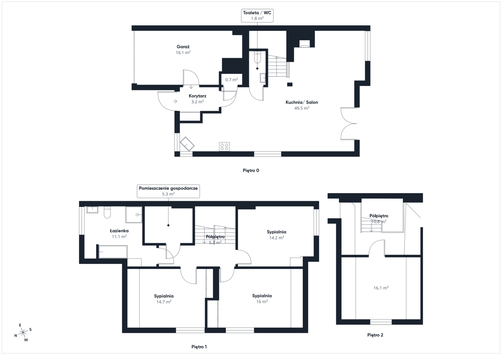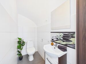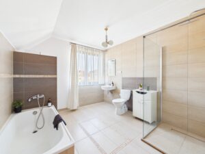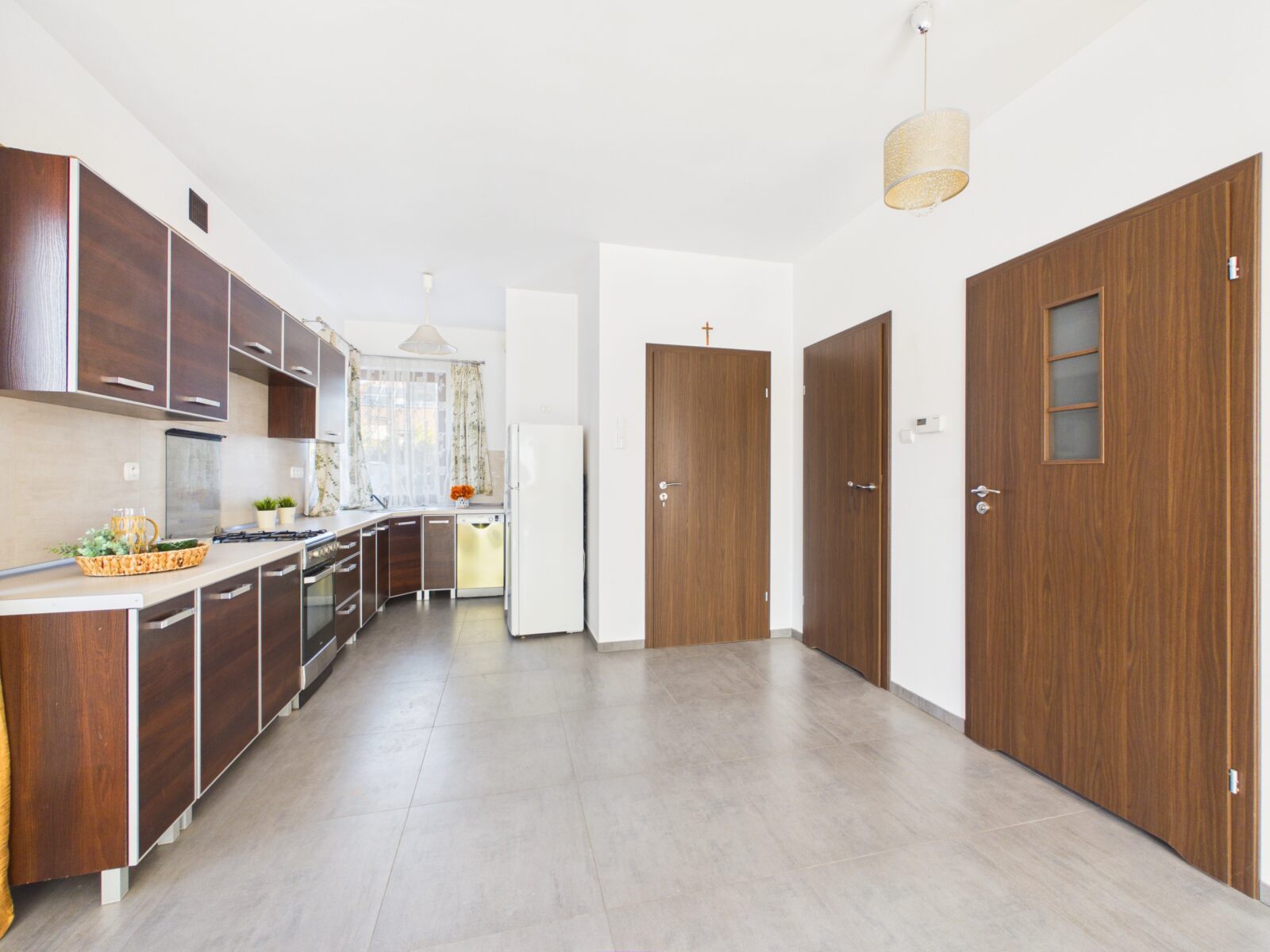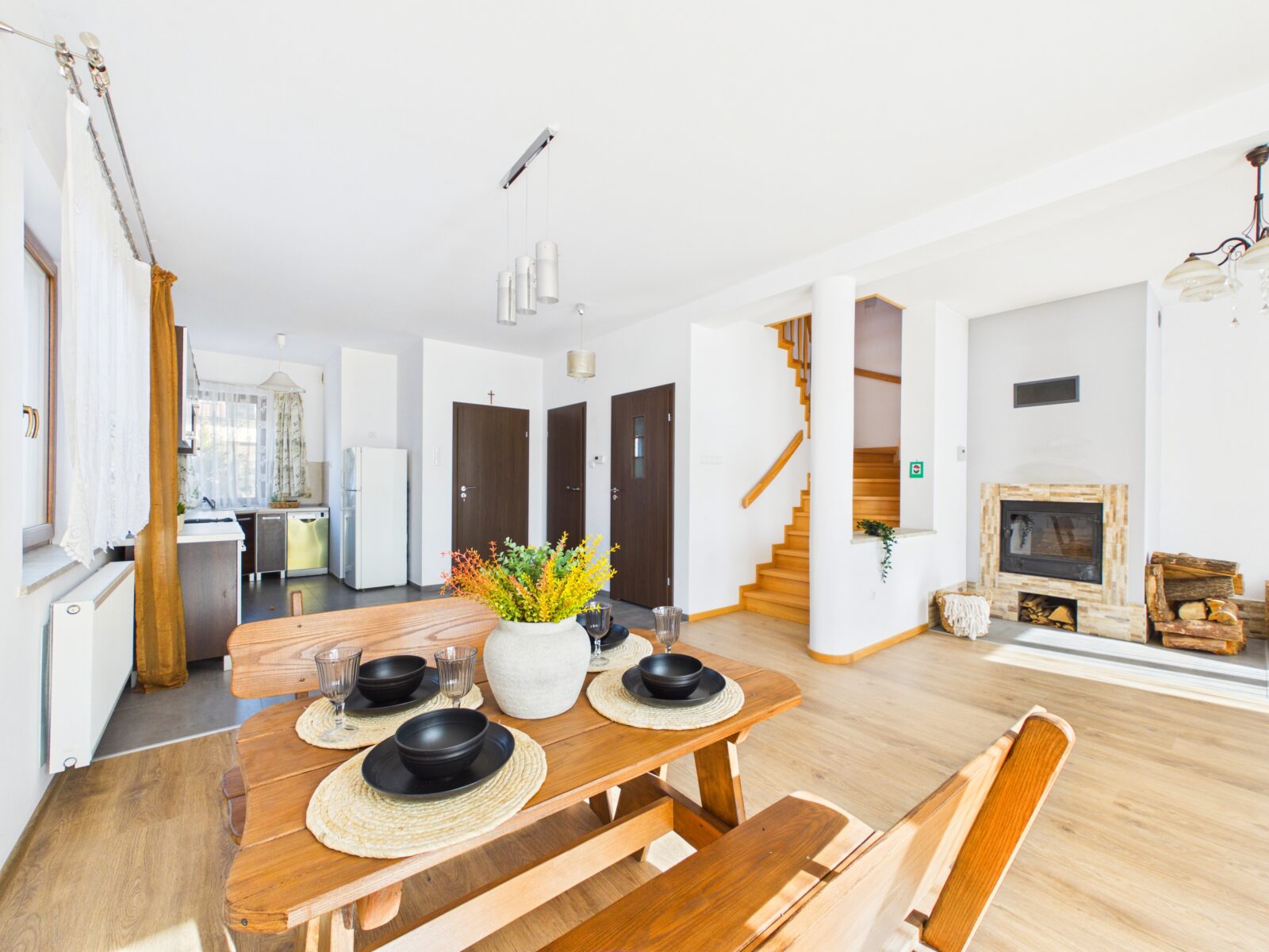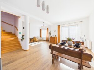 Dom ma przestronny salon z aneksem kuchennym, 5 pokoi, w tym 3 sypialnie na pierwszym piętrze oraz dodatkowy pokój na drugim piętrze, który idealnie nadaje się na biuro lub gabinet.