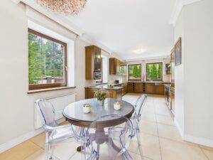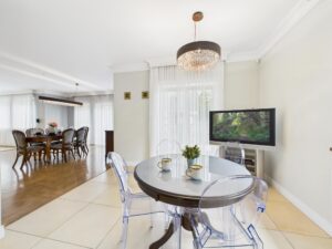 - Duży salon z przeszkleniami – naturalne światło, przestrzeń do spotkań i wypoczynku