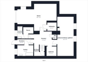 Dom ma 6 pokoi, w tym przestronny salon z kominkiem, trzy sypialnie na piętrze oraz dodatkowe pomieszczenia, takie jak garderoby i pokój z sauną. Na parterze znajduje się również kuchnia z aneksem oraz toaleta.