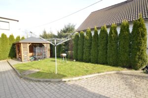 Na zewnątrz znajduje się parking utwardzony kostką betonową oraz mały ogród z wiatą wypoczynkową.