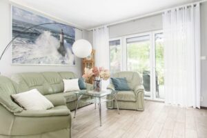 - Podłogi w pomieszczeniach: Panele, Płytki