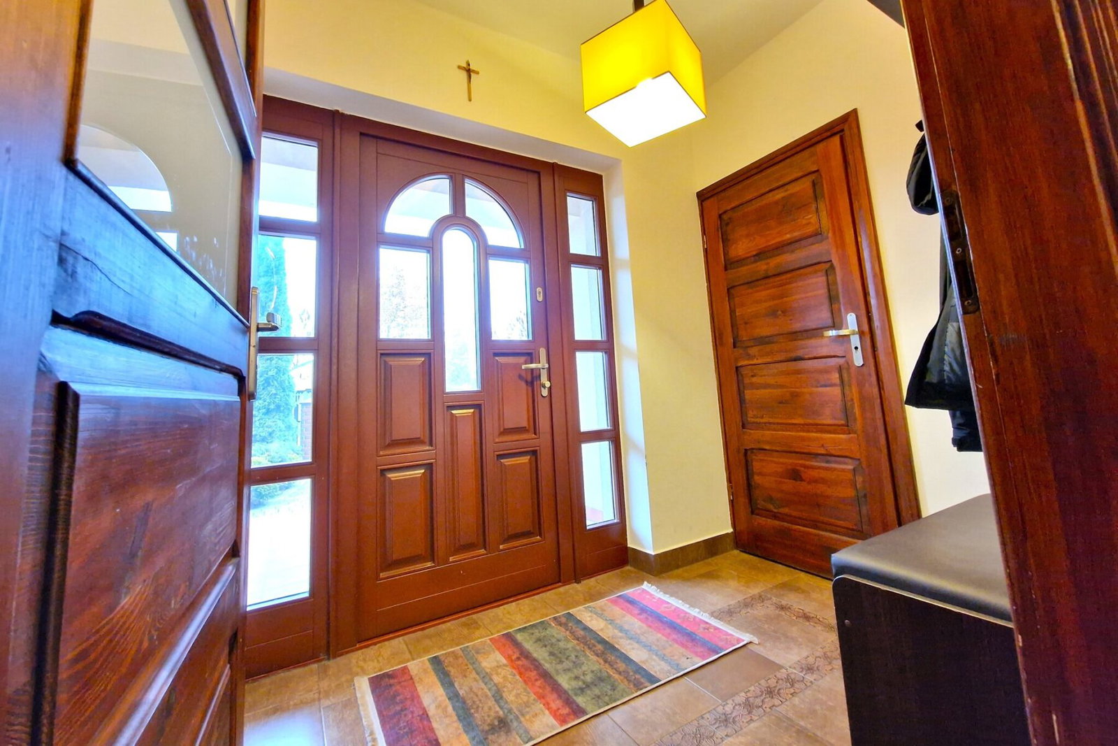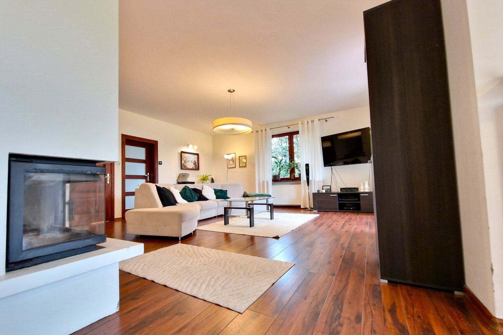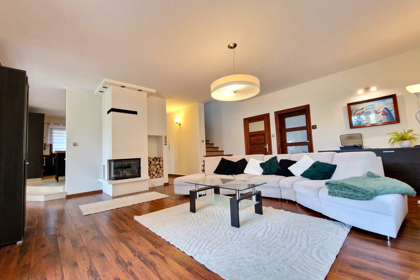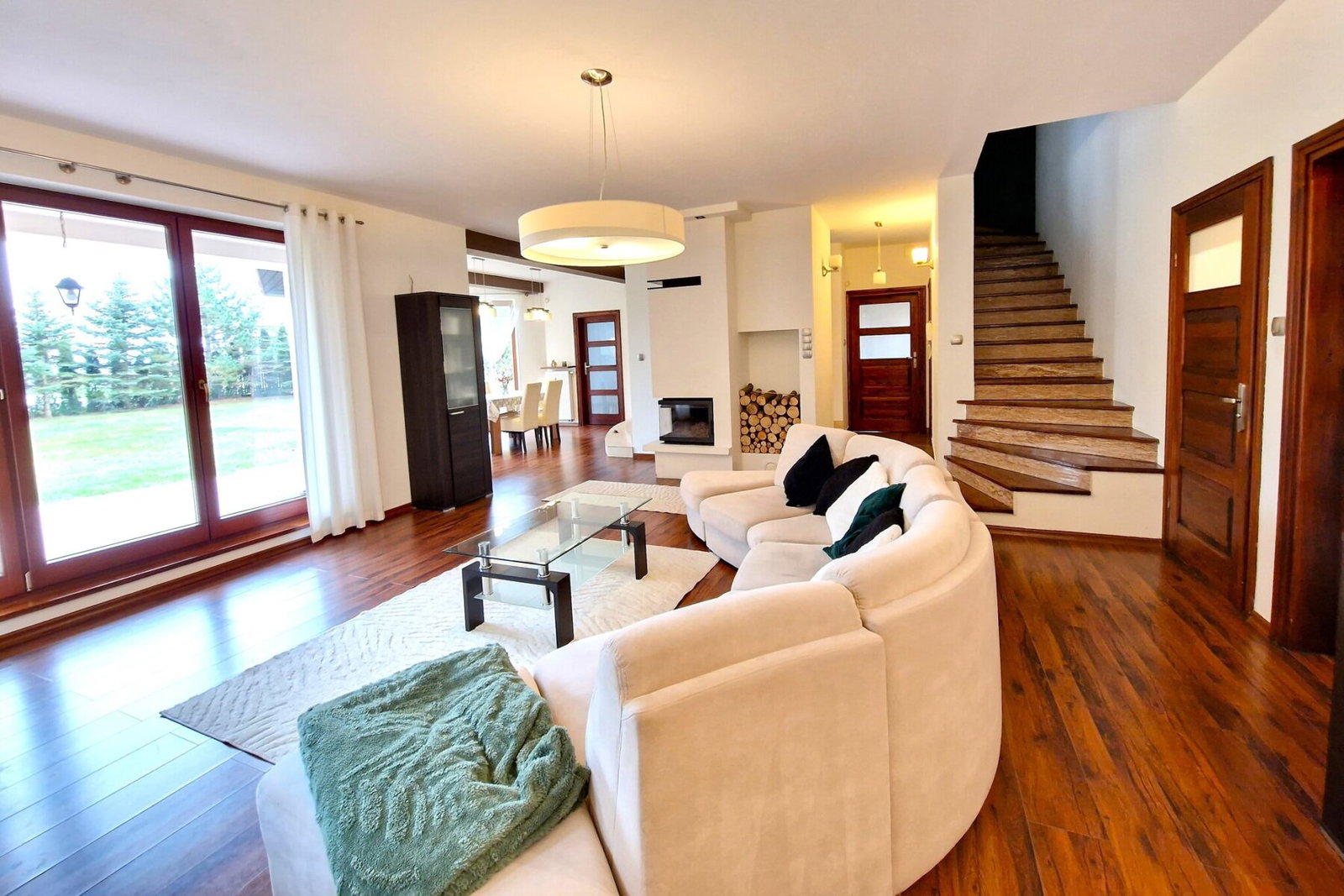 Dom ma funkcjonalny układ z 6 pokojami, w tym przestronnym salonem z wyjściem na taras, jadalnią, kuchnią oraz gabinetem. Na piętrze znajdują się dodatkowe pokoje, w tym sypialnia główna z garderobą i łazienką.