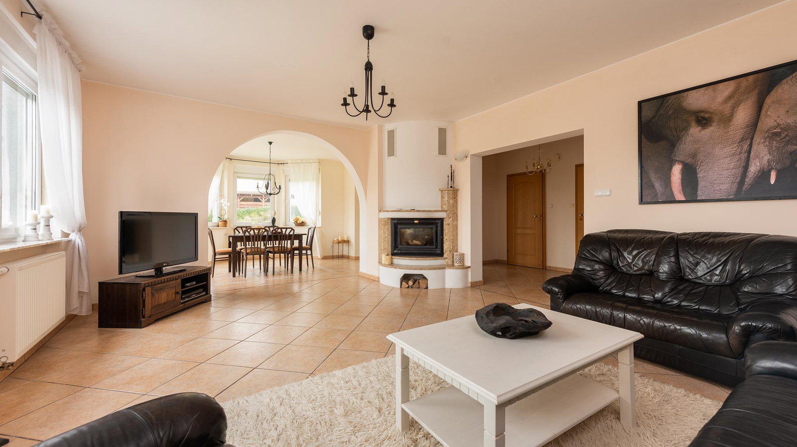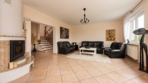 - Przestronny salon z kominkiem – serce domu, idealne na rodzinne spotkania i wieczory w klimacie przytulności.