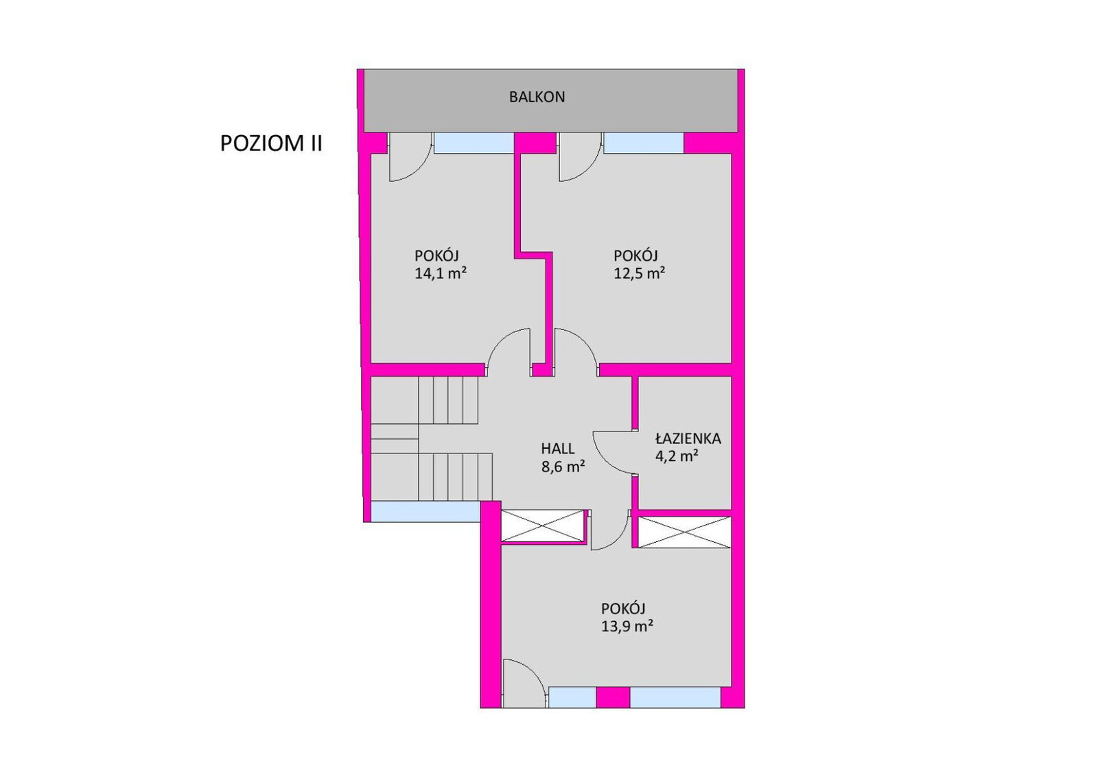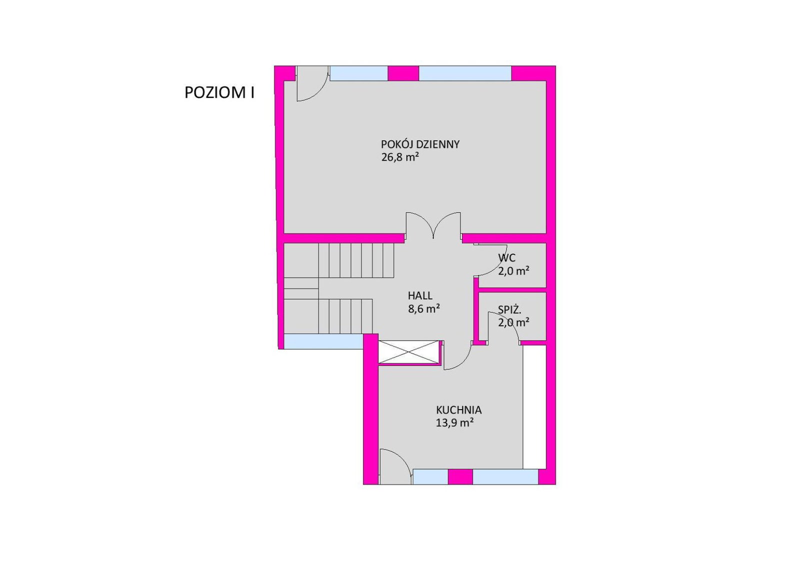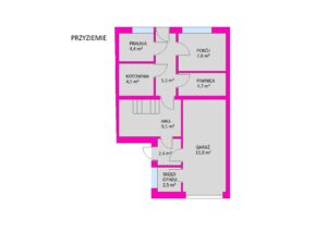 - Powierzchnie pokoi: 14,1+12,5+13,9+26,8+7,8+9,2