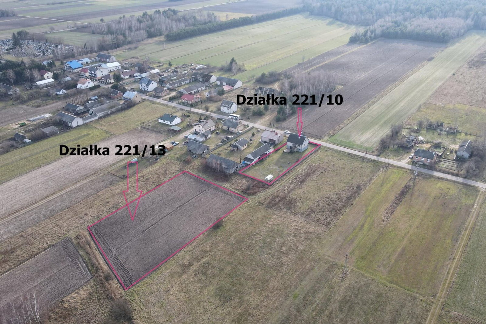 - działkę nr 221/13 o powierzchni 4023 m2 (w kształcie trapezu, wymiary ok. 74mx54m) znajdującą się za ogrodzeniem działki z domem, która widnieje w ewidencji gruntów jako łąka.