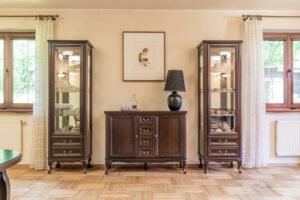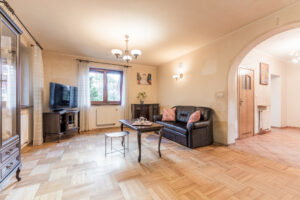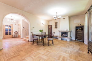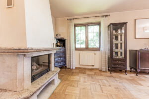W pierwszym domu znajduje się pięć pokoi, w tym przestronny salon z kominkiem, kuchnia, biblioteka oraz sypialnia z wyjściem na taras. Na piętrze jest również wydzielony apartament z własną łazienką. Drugi dom to parterowy budynek z lat 40-tych, który wymaga remontu.