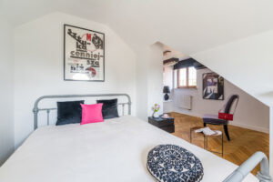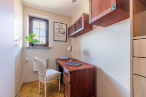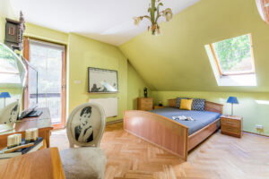 Na piętrze wydzielona powierzchnia: pokój z aneksem sypialnianym i biurowym oraz wydzielonym pokojem łazienkowym.