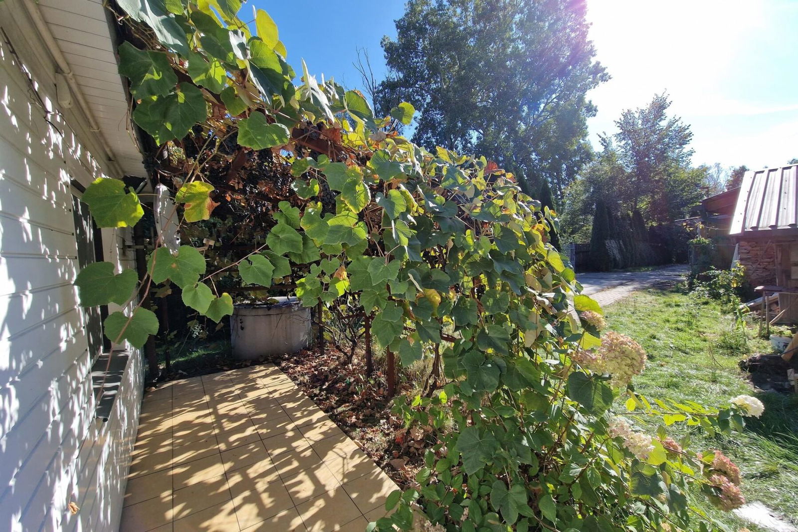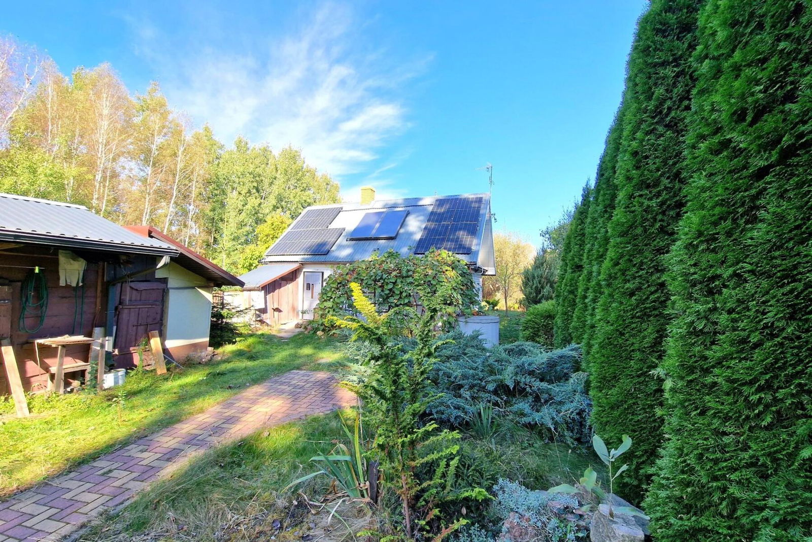 Przed domem znajduje się pokryta płytkami altana otoczona ładną winoroślą. Pomiędzy budynkiem a trasą E30 znajduje się sad z drzewami owocowymi co znacznie izoluje działkę od drogi.