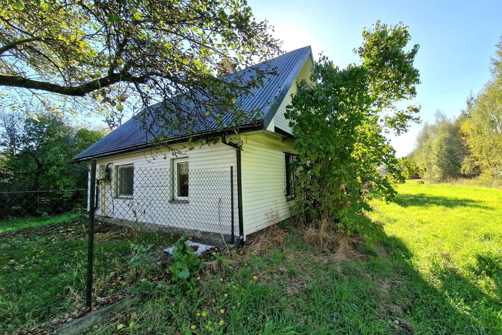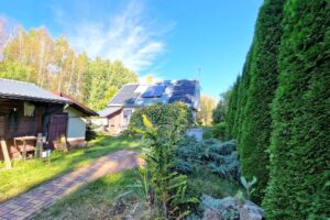 Nieruchomość wokół domu ogrodzona siatką oraz przesuwną bramą. Do wykorzystania i zagospodarowania pozostaje jeszcze duża część działki znajdująca się od południowej strony za ogrodzeniem.