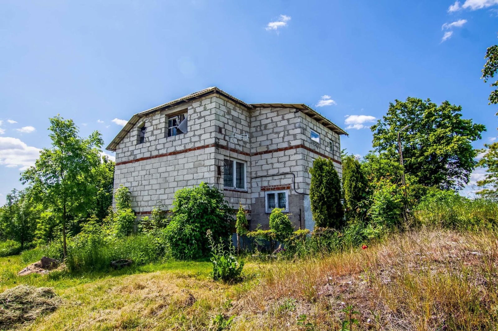 Dom z lat osiemdziesiątych, do generalnego remontu. Budynek piętrowy z poddaszem użytkowym liczącym 5 sypialni, kuchnię łazienkę i WC, ogrzewany piecem CO. Garaż jednostanowiskowy w bryle budynku. Na dachu eternit falisty, okna drewniane starego typu, ściany z 1,5 pustaka.