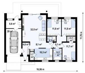 Powierzchnie zabudowy domu 214,18 m2: Wiatrołap 5,22 m2; Spiżarnia 2,25; Kuchnia 12,69; Salon + Jadalnia 33,22; Hol 12,51; Sypialnia 15,61; Łazienka 6,28; Pokój 14,00; Pokój 12,36; Łazienka 2,45; Kotłownia 4,36; Garaż 26,33