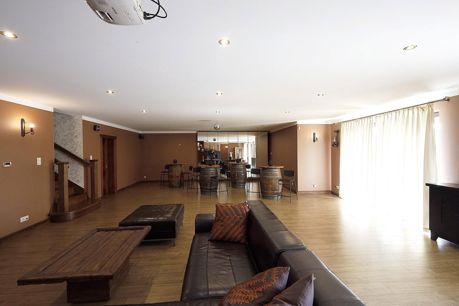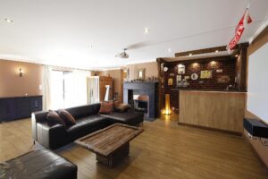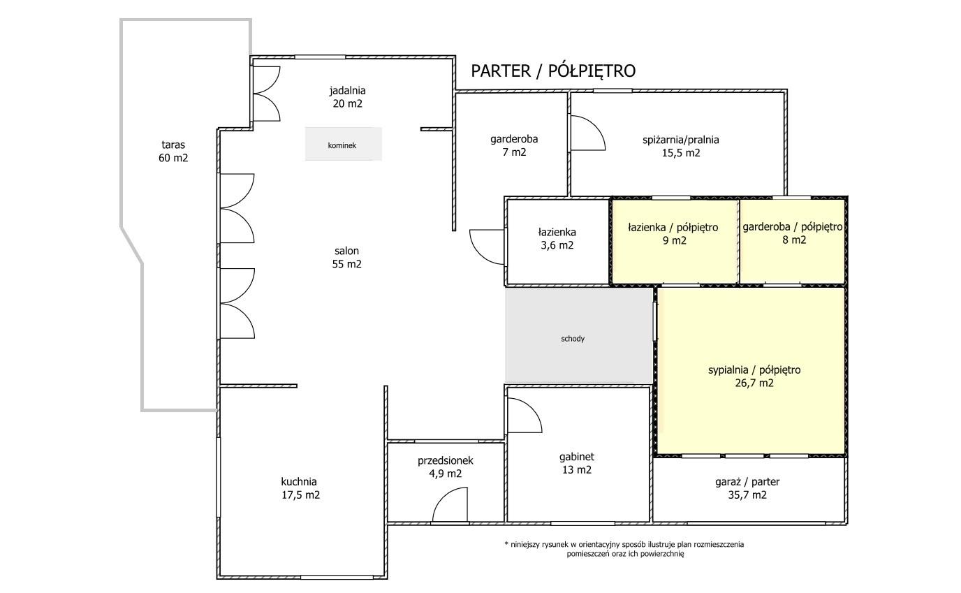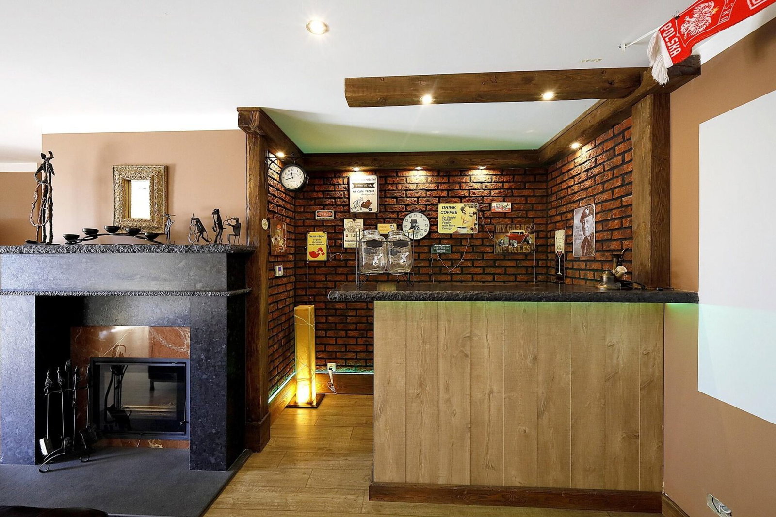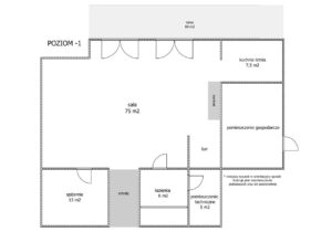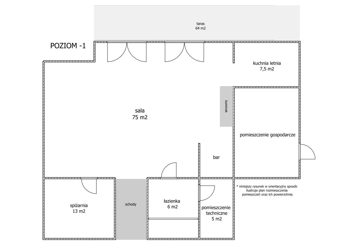 - Strefa relaksu i rozrywki (82 m²) – bar, sauna, kominek i kino domowe